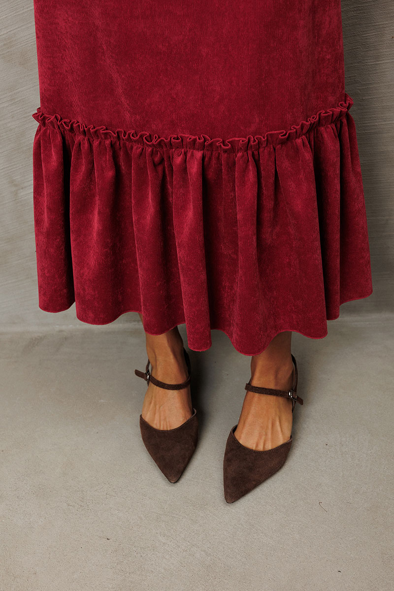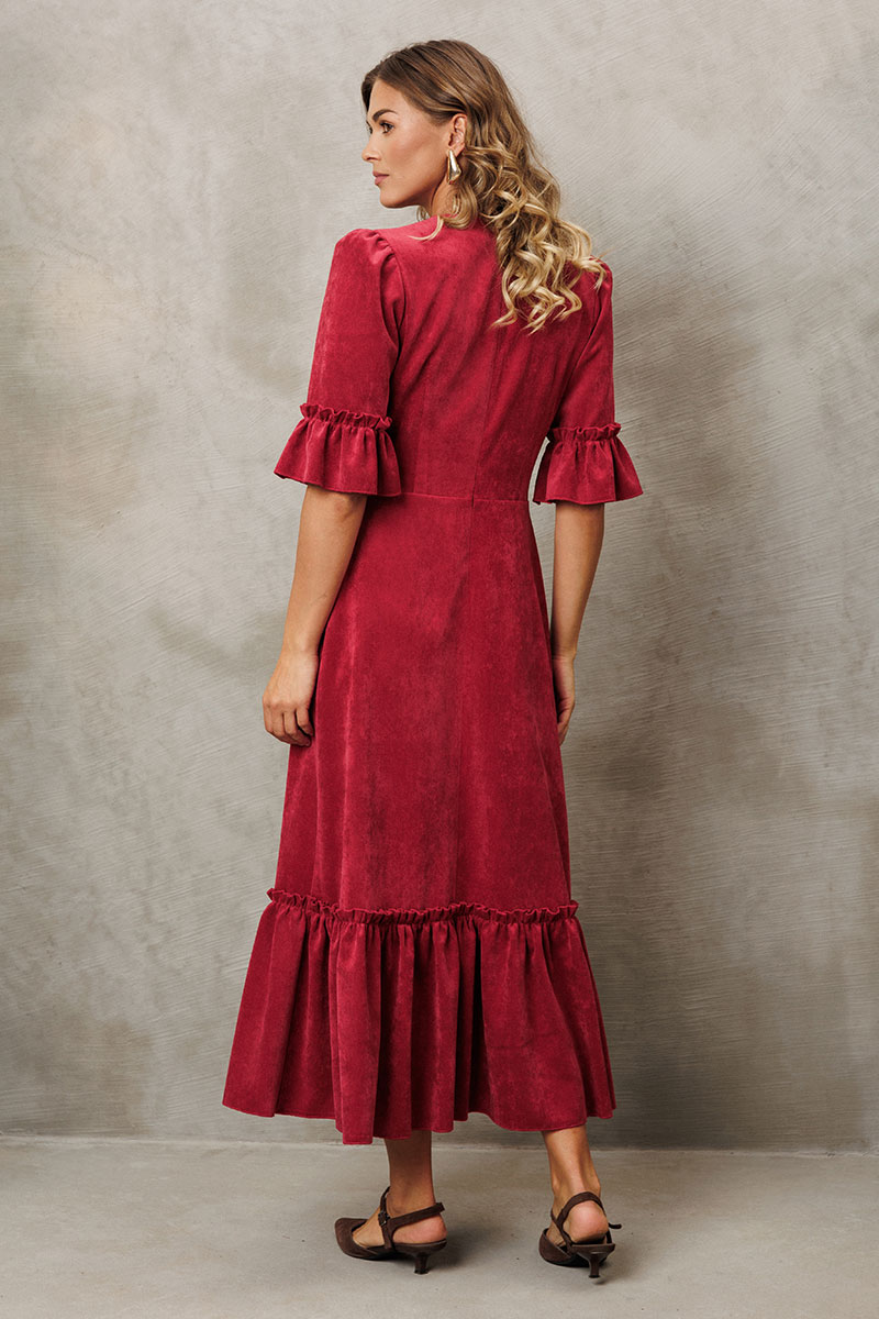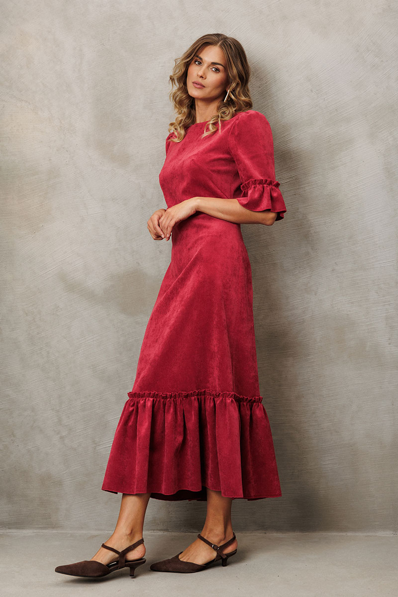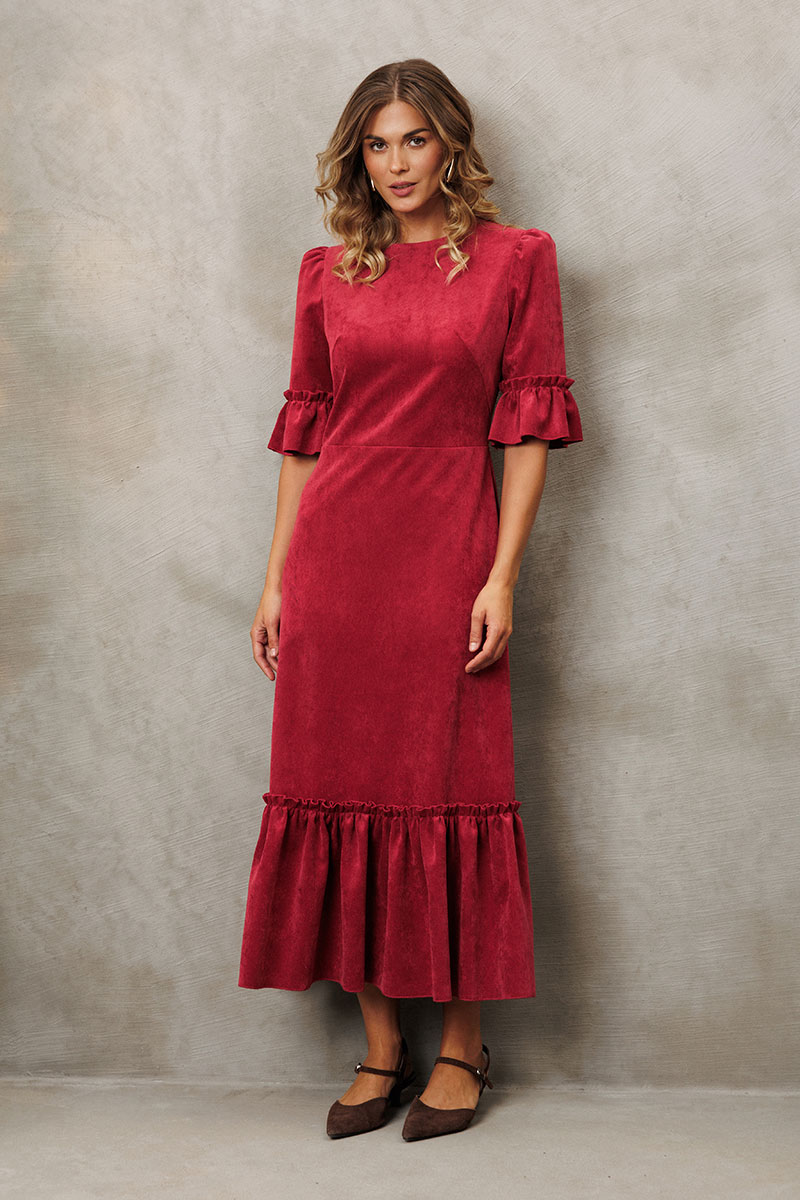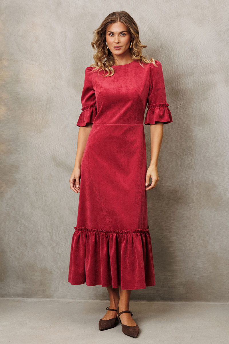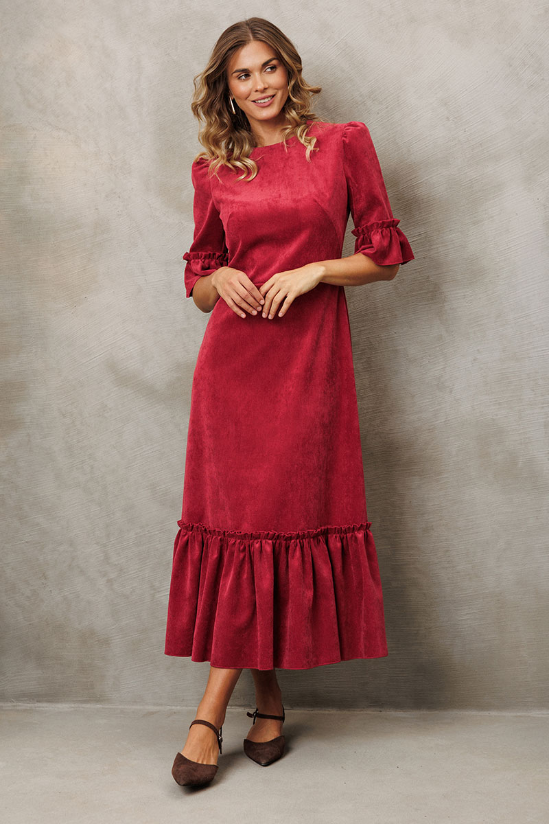 Платье приталенного силуэта отрезное по линии талии из мягкой вельветовой ткани. Верхняя часть переда с нагрудной вытачкой. Спинка со средним швом и потайной молнией. Рукав втачной со сборкой по окату. По низу рукава и по низу изделия волан.