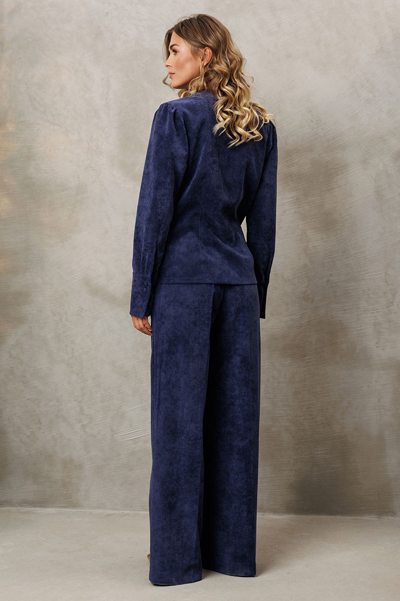 Блузка оригинальная приталенного силуэта из вельветовой ткани. Перед с подрезом под грудью, сборкой в районе груди и талиевыми вытачками. Затсежка на петли и пуговицы. Горловина V-образной формы. Спинка с талиевыми вытачками. Рукав втачной со сборкой по окату и с манжетой по низу. Манжета высокая с двумя петлями и пуговицами.