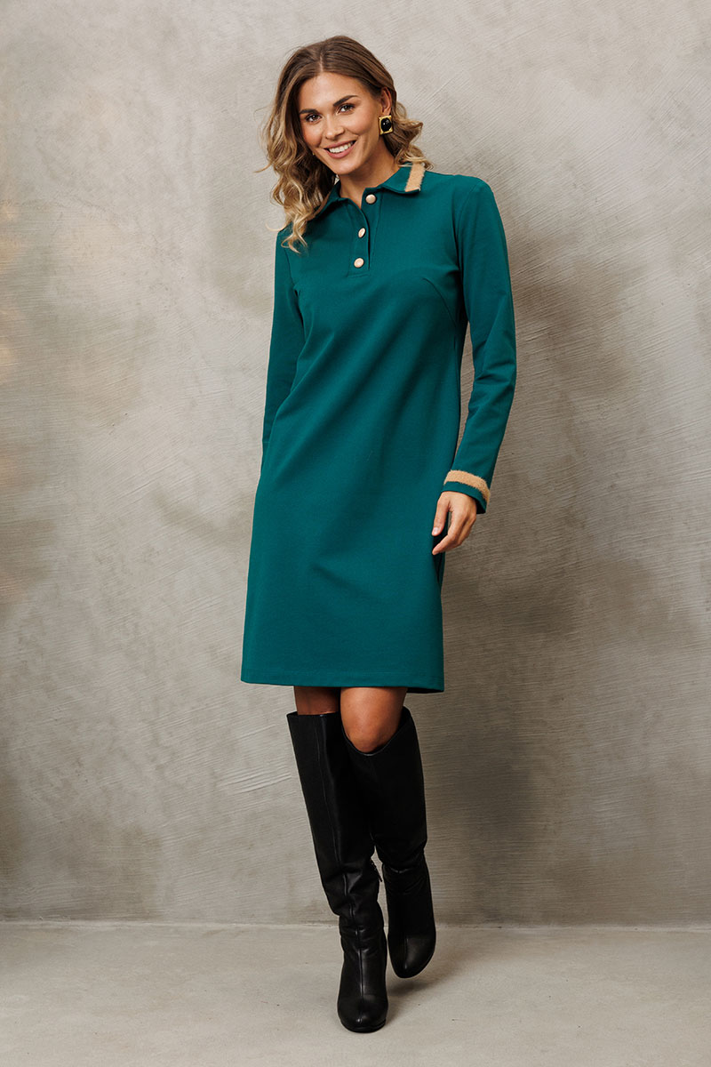 Платье слегка приталенного силуэта из плотного трикотажного полотна. Перед с застежкой поло и нагрудными вытачками. По воротнику и низу рукава настрочена декоративная тесьма.