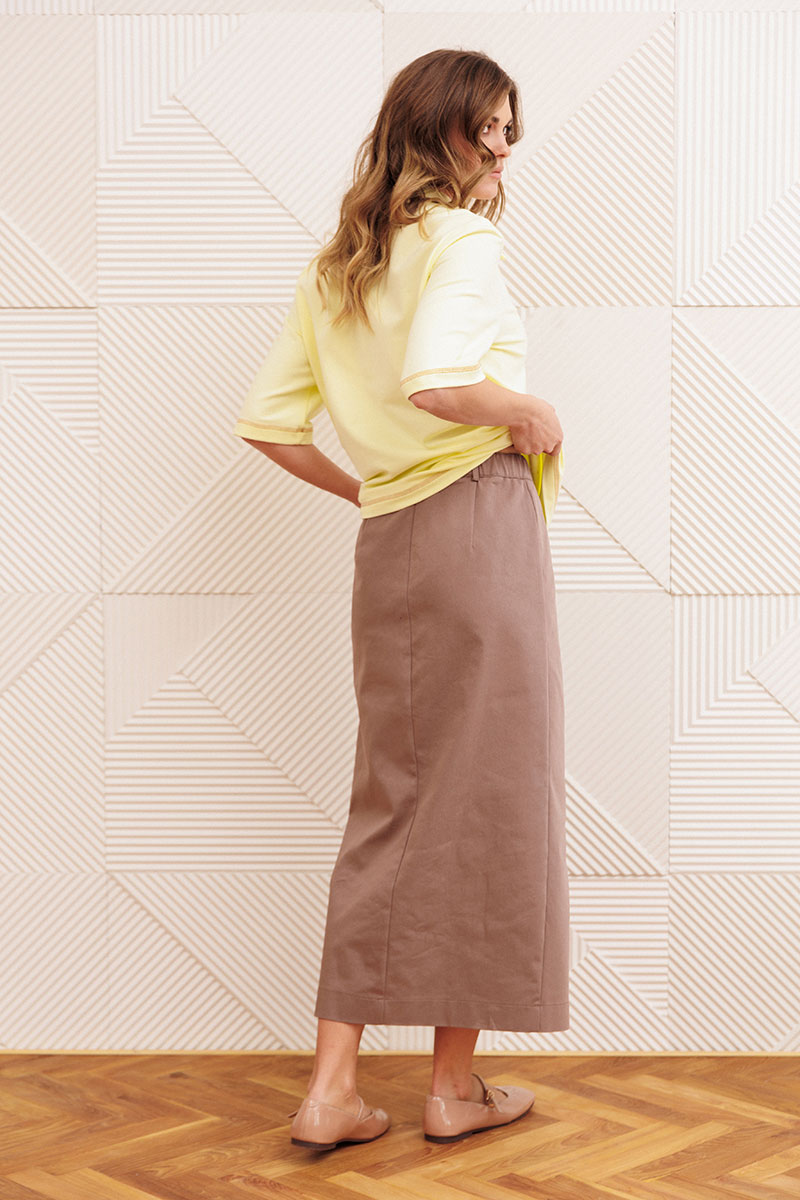 Юбка прямого силуэта выполненная из джинсовой ткани. Передняя честь юбки с вытачками, со средним швом и застежкой гульфиком на молнии и щлицей спереди. Задняя часть юбки с вытачками. Юбка на притачном поясе с затежкой на петлю и пуговицу спереди и резинками по бокам.