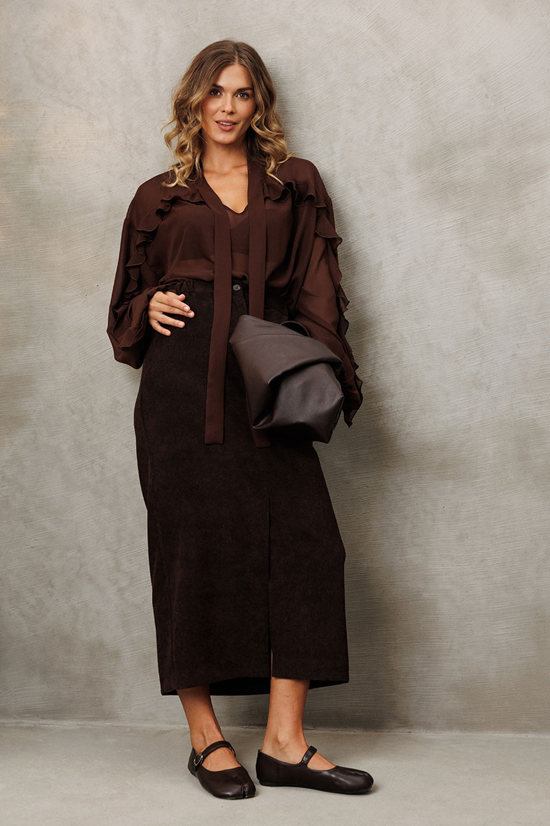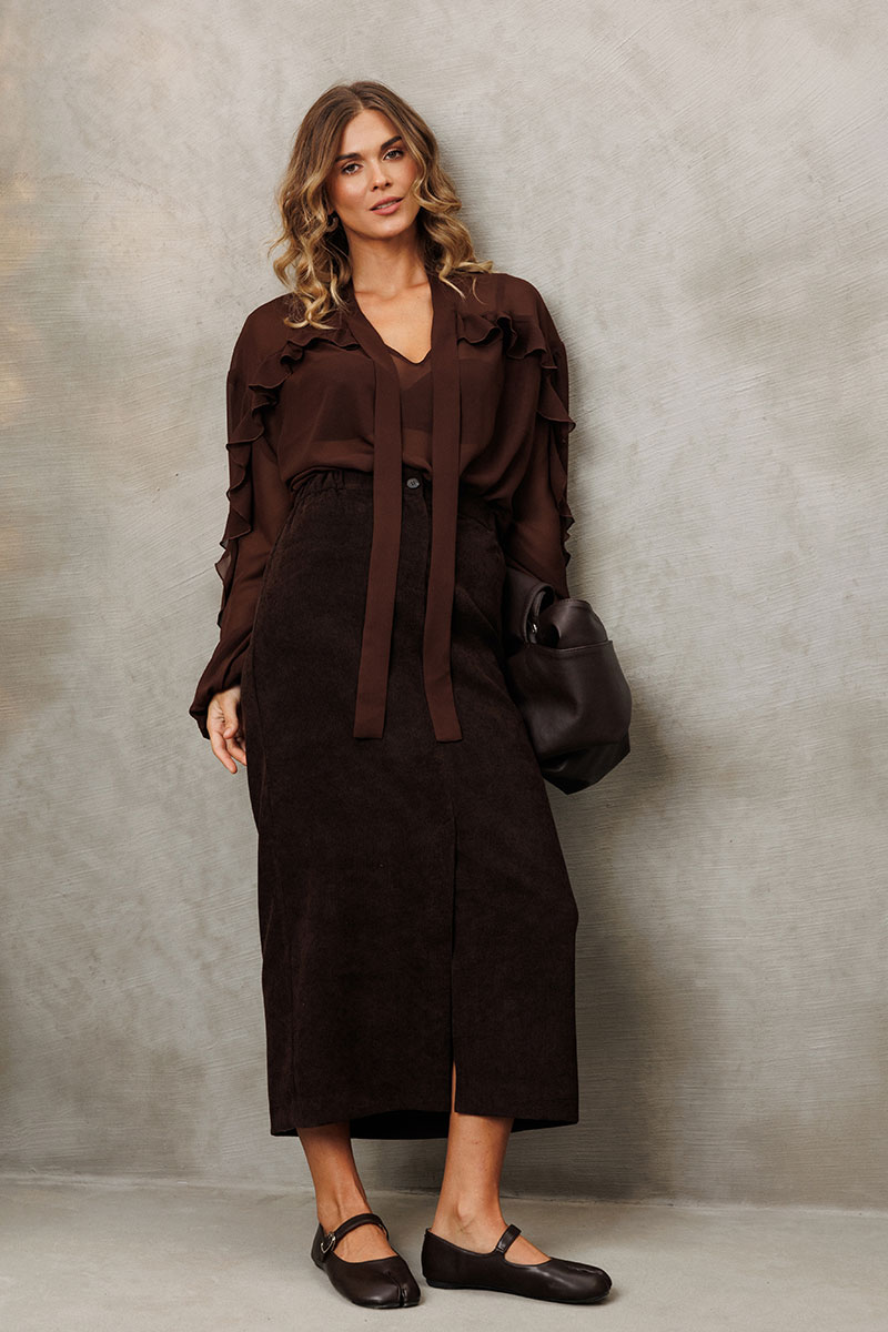 Юбка прямого силуэта выполненная из мягкой вельветовой ткани. Передняя честь юбки с вытачками, со средним швом и застежкой гульфиком на молнии и щлицей спереди. Задняя часть юбки с вытачками. Юбка на притачном поясе с затежкой на петлю и пуговицу спереди и резинками по бокам. Юбка на подкладке.