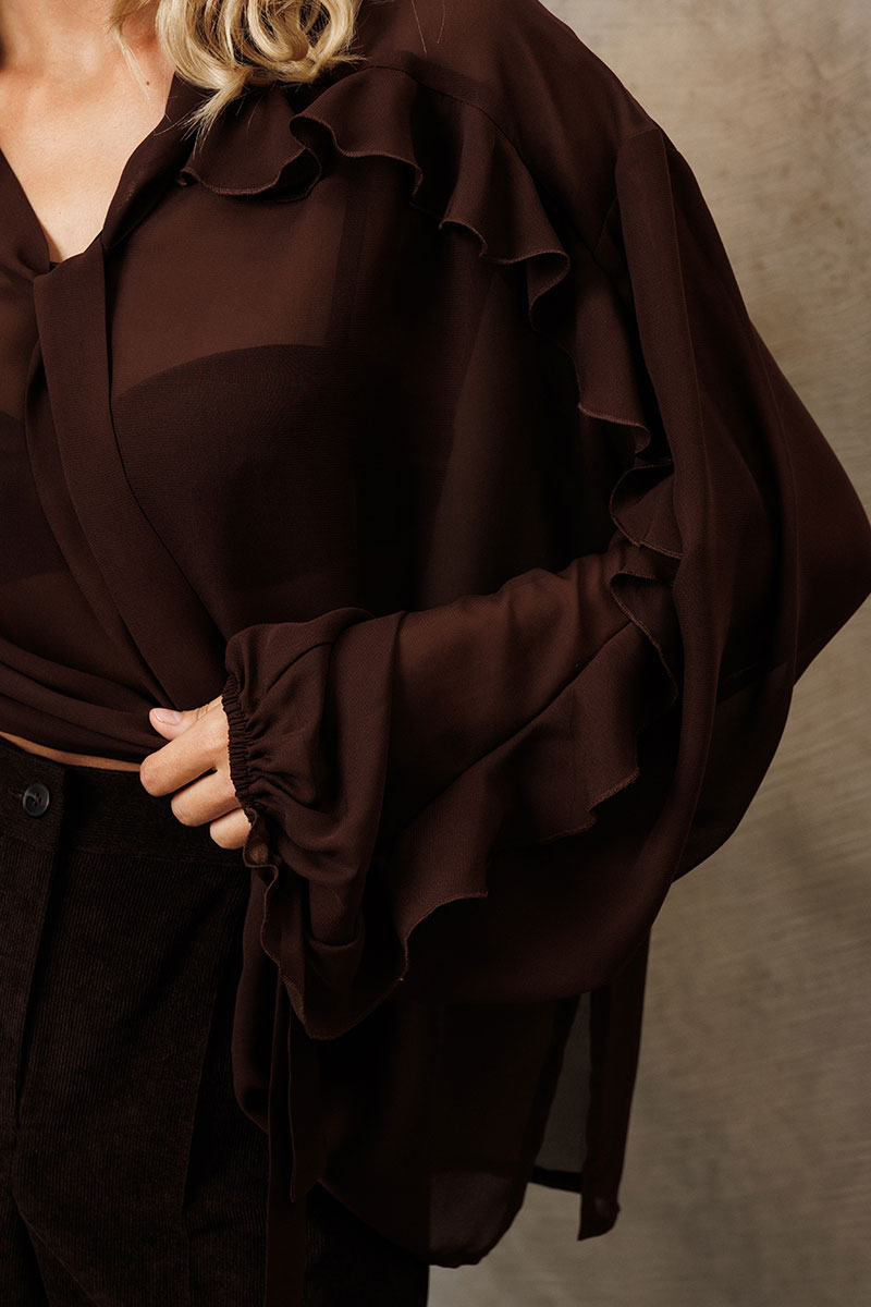 Блузка свободного силуэта из струящейся шифоновой ткани. Перед и спинка с кокеткой и сборкой. Рукав спущенный свободный с резинкой понизу. Вдоль линии кокетки и рукава вставлена рюша. Горловина V-образной формы с воротником стойкой переходящей в бант.