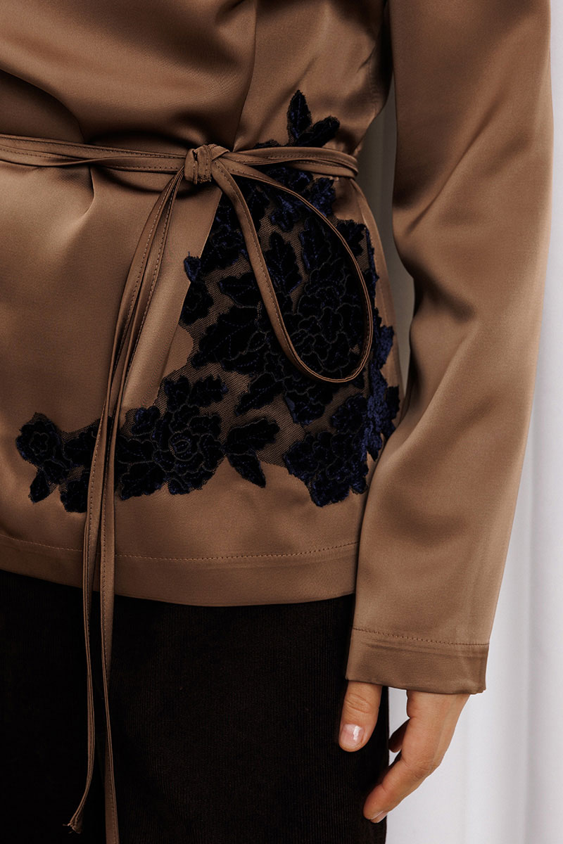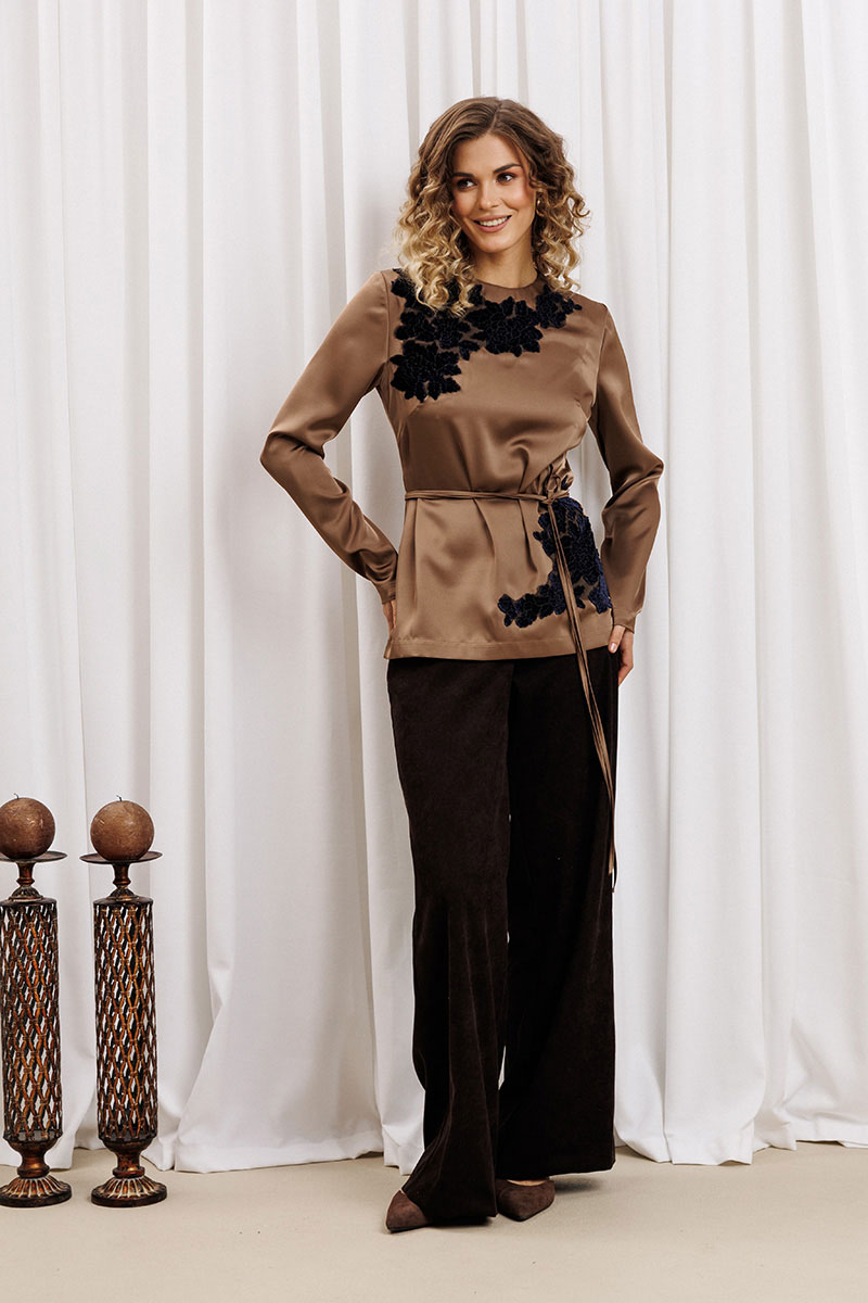 Блузка прямого силуэта выполнена из атласной ткани. Перед с нагрудной вытачкой. Спинка со средним швом и застежкой "капелькой" на петлю и пуговицу сверху. Рукав втачной одношовный. В боковых швах разрезы. По переду настрочена аппликация из велюровых цветов на сетке. К блузке прилагается пояс из основной ткани.