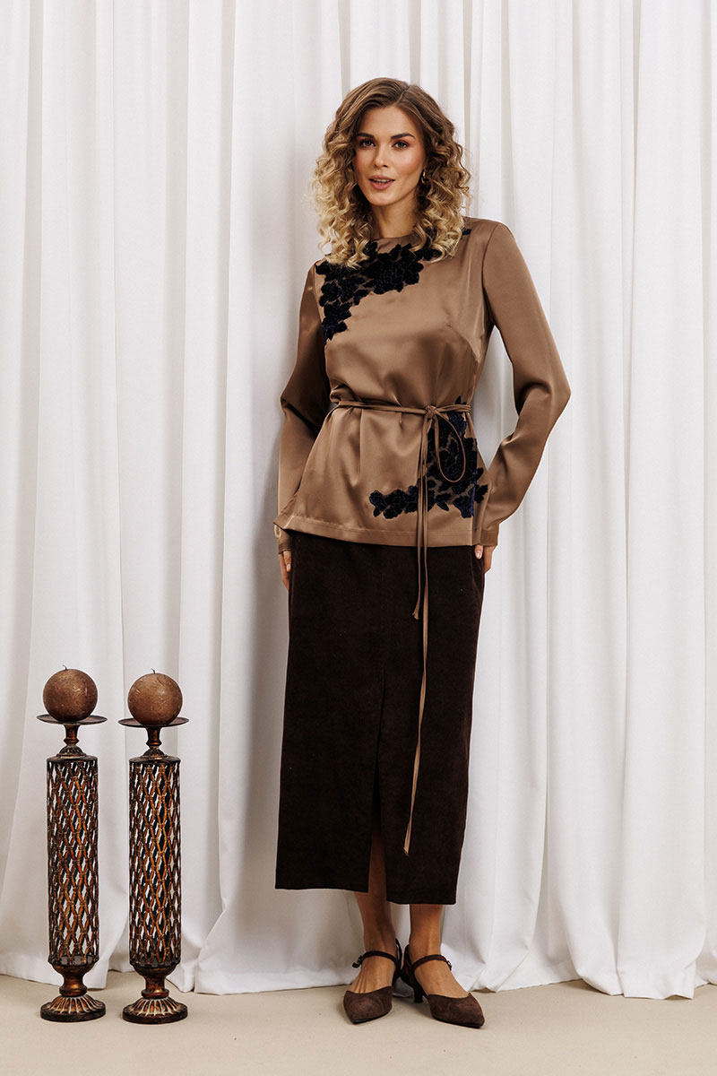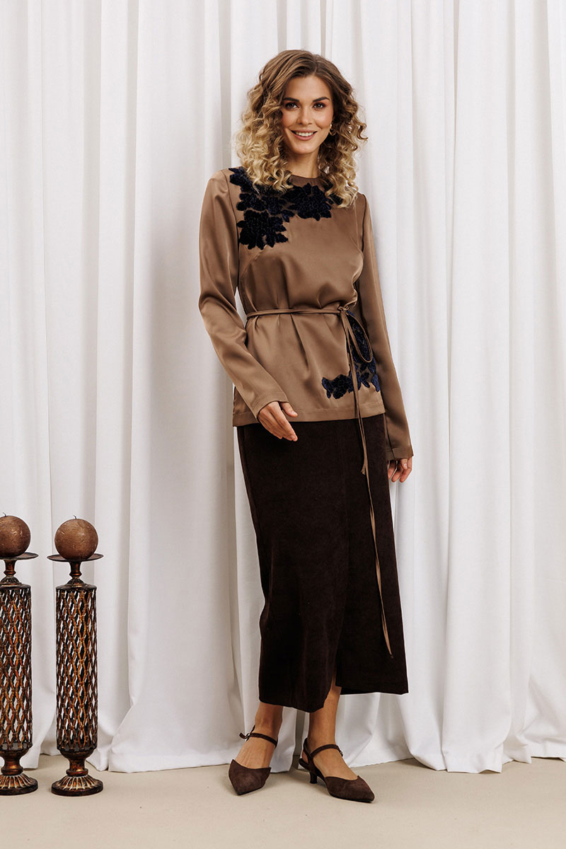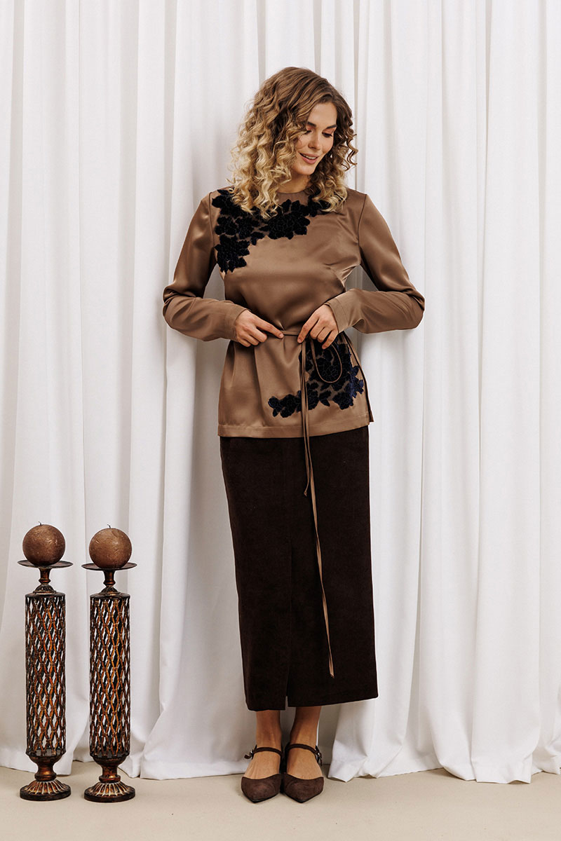 Блузка прямого силуэта выполнена из атласной ткани. Перед с нагрудной вытачкой. Спинка со средним швом и застежкой "капелькой" на петлю и пуговицу сверху. Рукав втачной одношовный. В боковых швах разрезы. По переду настрочена аппликация из велюровых цветов на сетке. К блузке прилагается пояс из основной ткани.