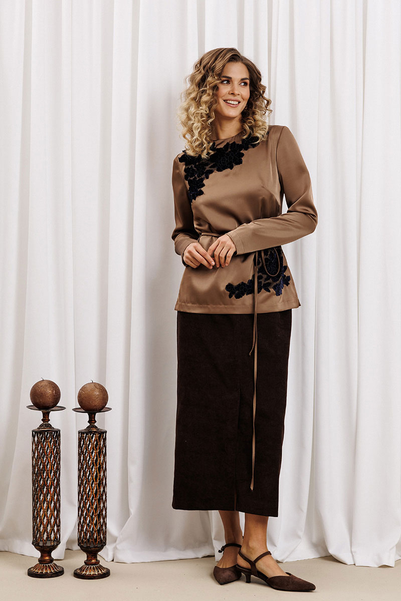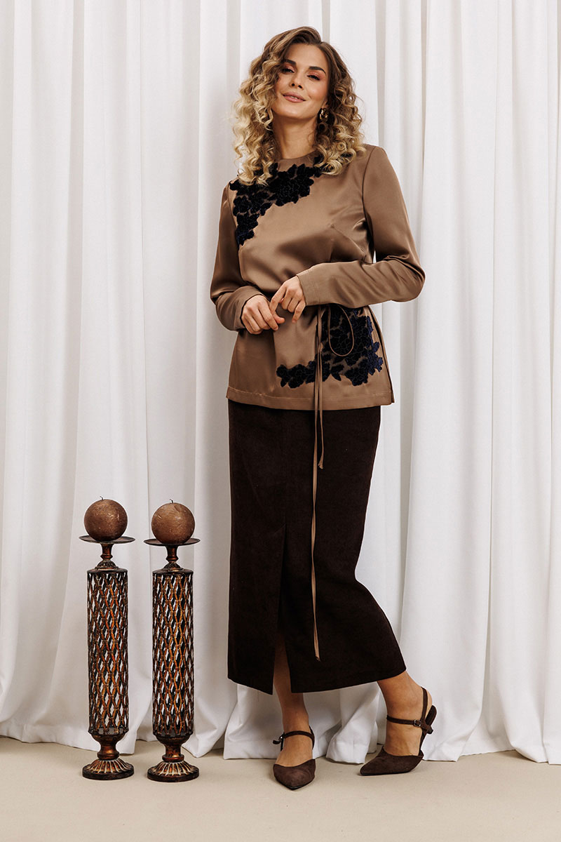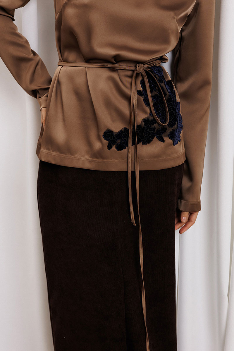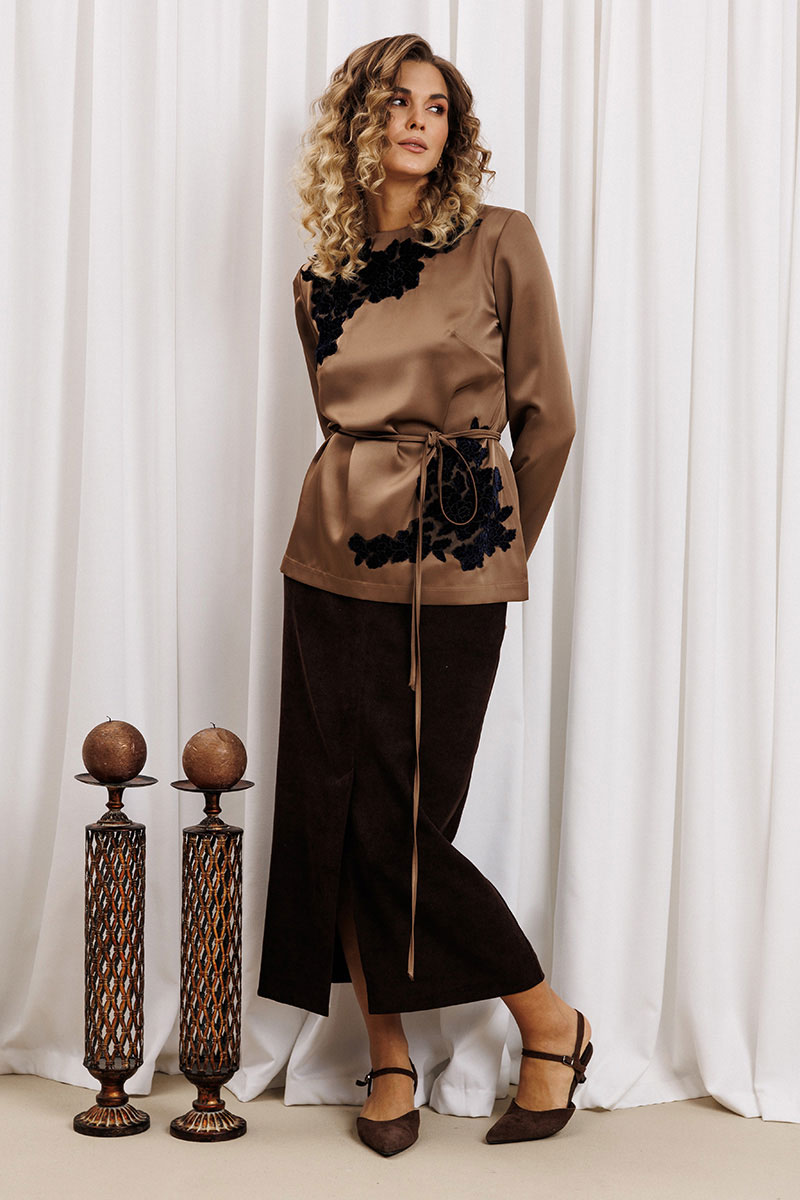 Блузка прямого силуэта выполнена из атласной ткани. Перед с нагрудной вытачкой. Спинка со средним швом и застежкой "капелькой" на петлю и пуговицу сверху. Рукав втачной одношовный. В боковых швах разрезы. По переду настрочена аппликация из велюровых цветов на сетке. К блузке прилагается пояс из основной ткани.