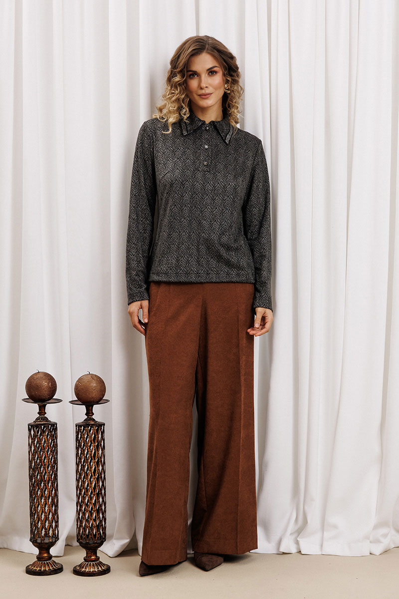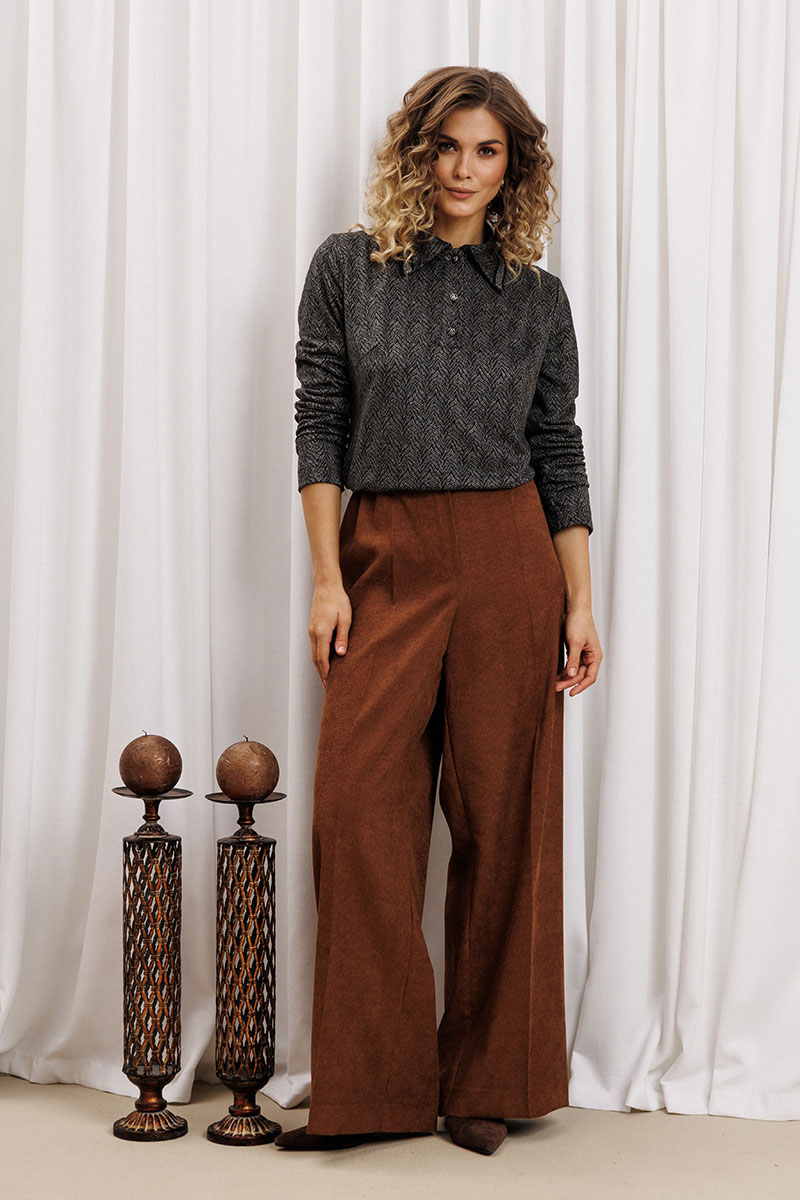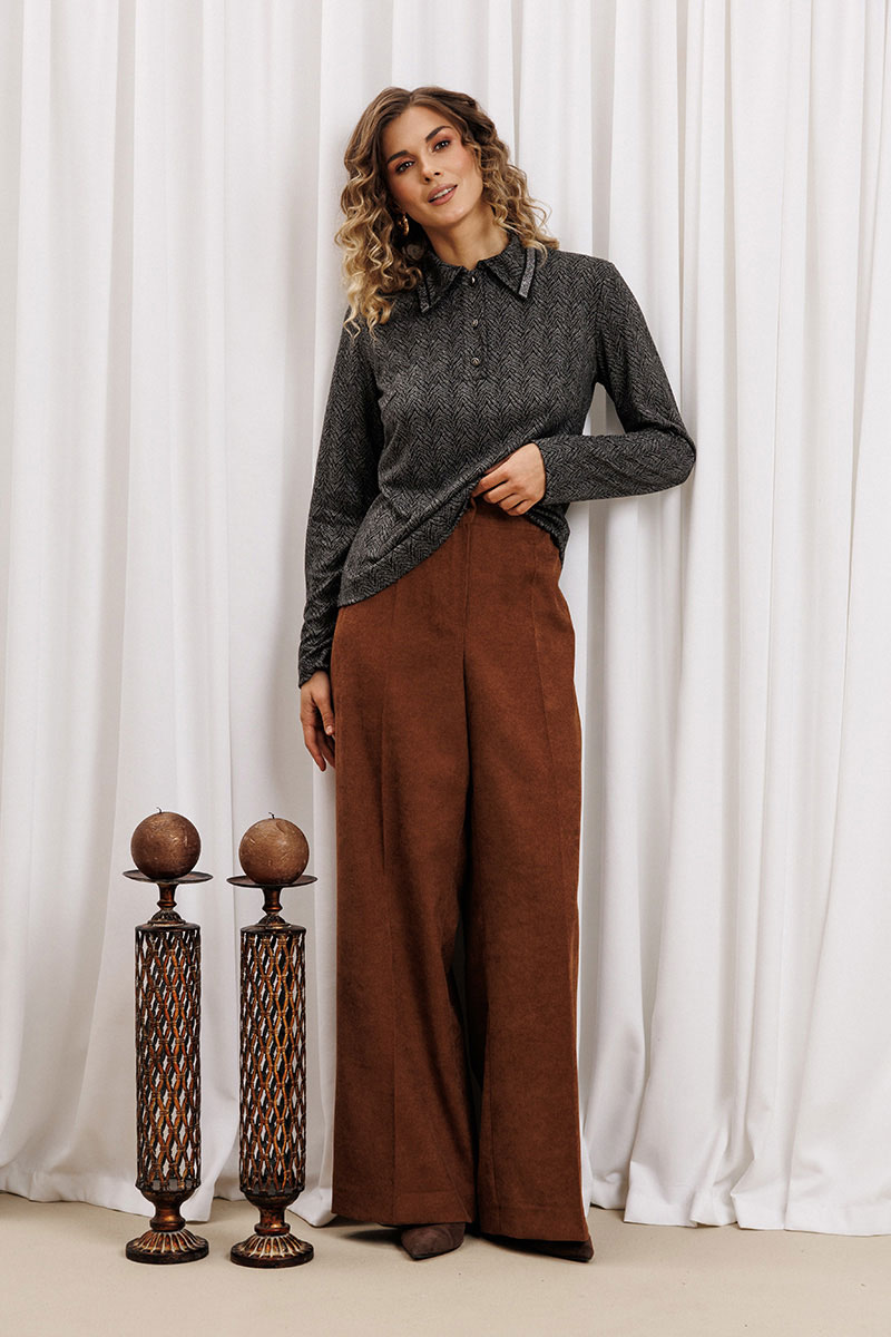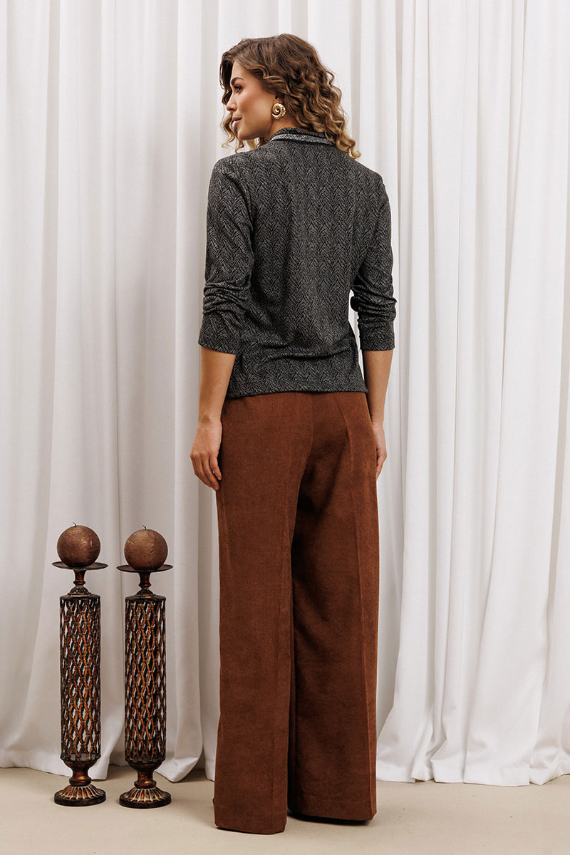Брюки палаццо с притачным поясом из мягкой вельветовой ткани. Спереди застежка гульфик на молнии и петлей и пуговицей по поясу. По задней частям брюк вытачки. Пояс с резинкой в боковых частях. Брюки с заутюженными стрелками.