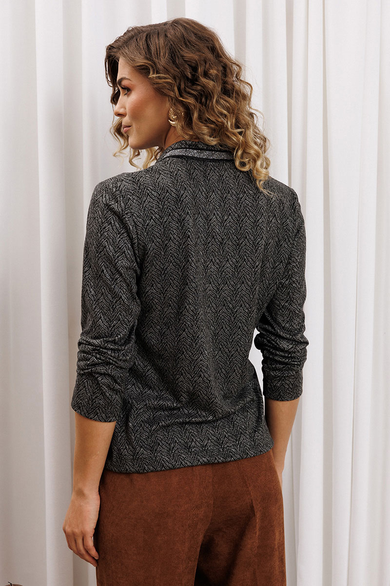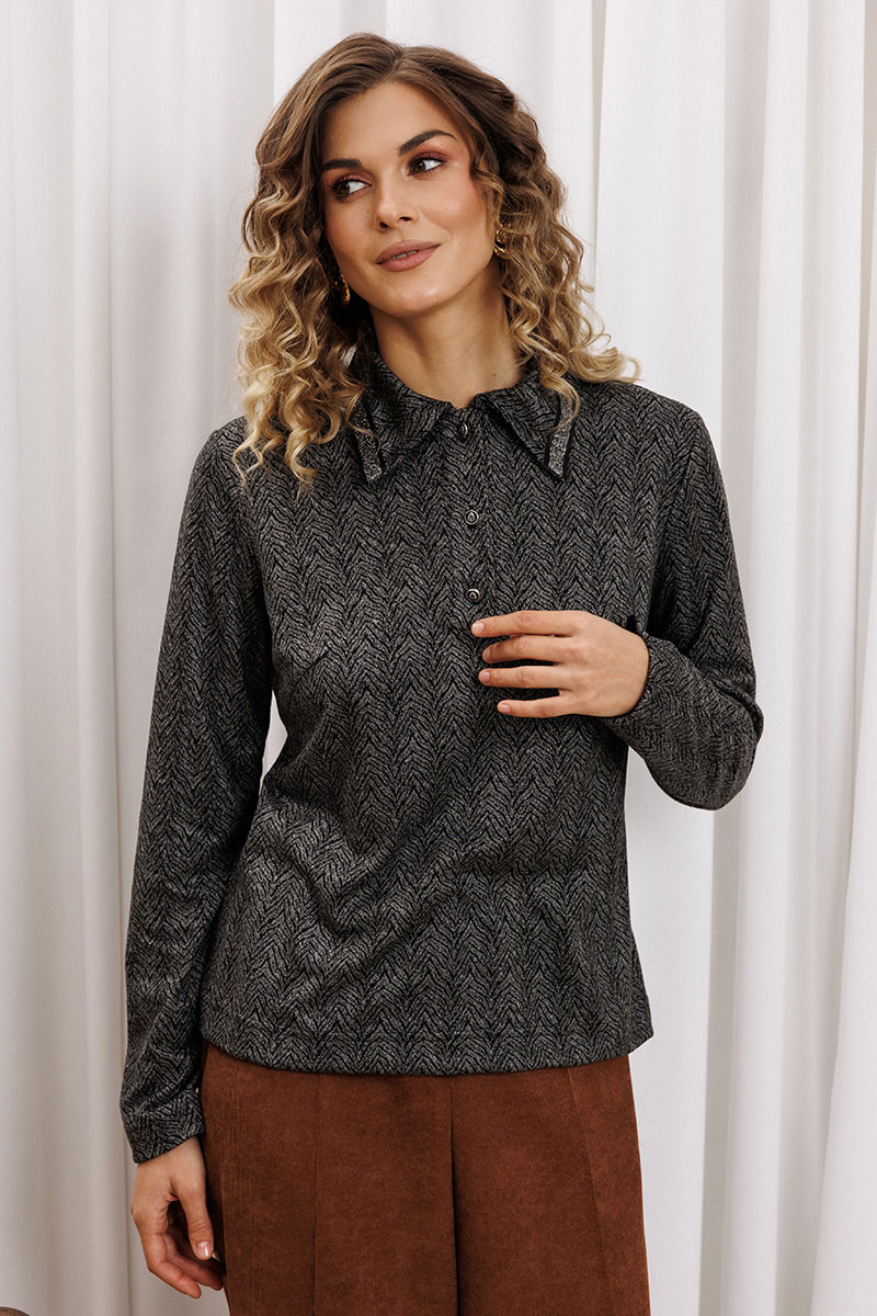 Джемпер прямого силуэта из трикотажного змшевого полотна с тигровым рисунком. Перед с застежкой поло и нагрудными вытачками. По воротнику настрочена декоративная тесьма.