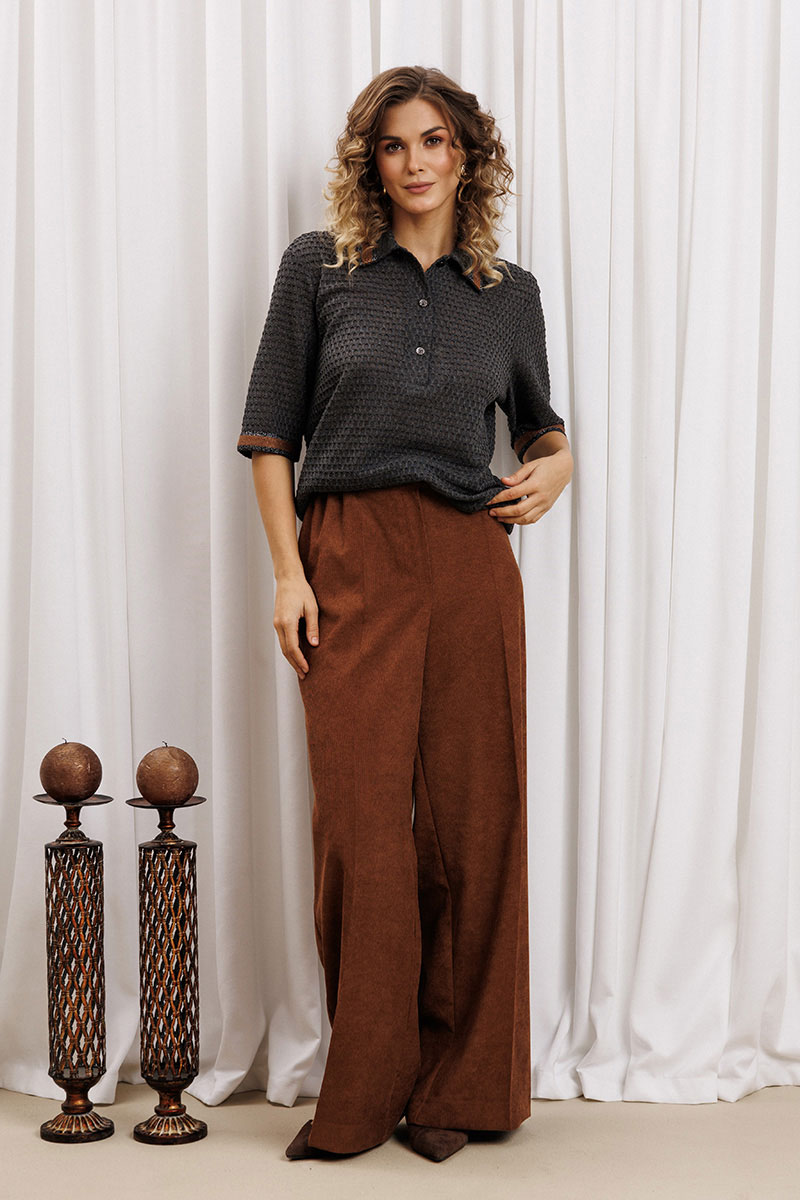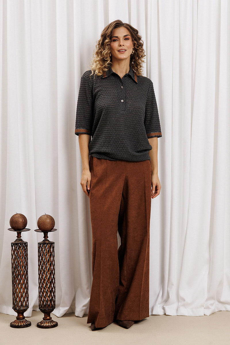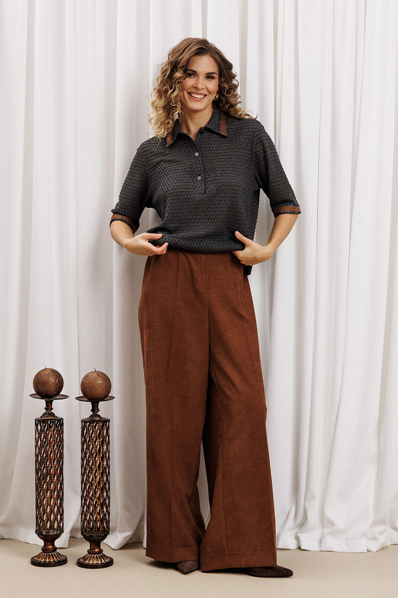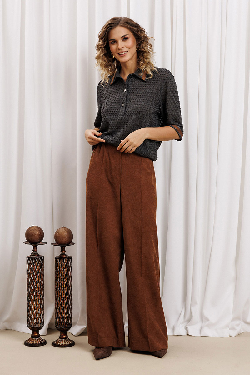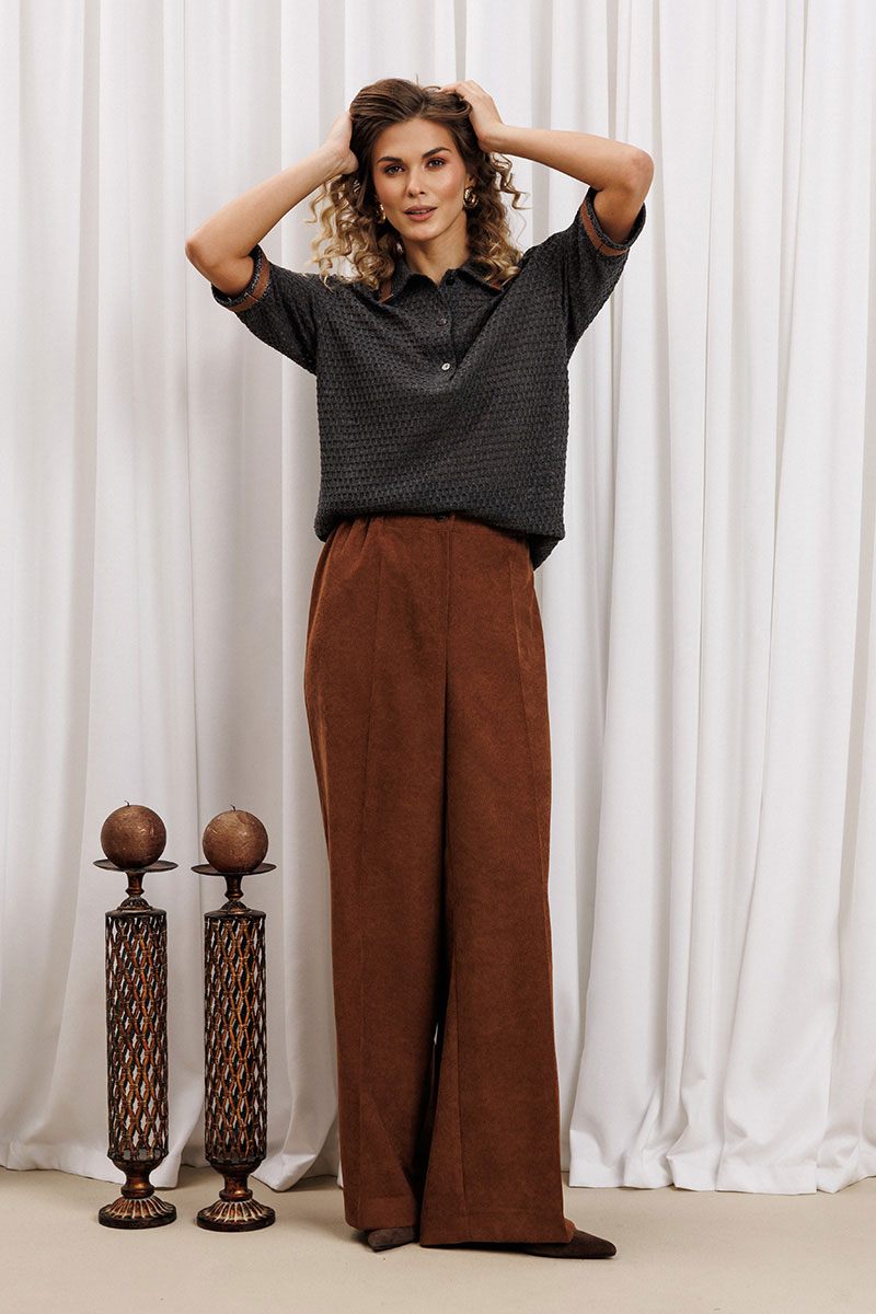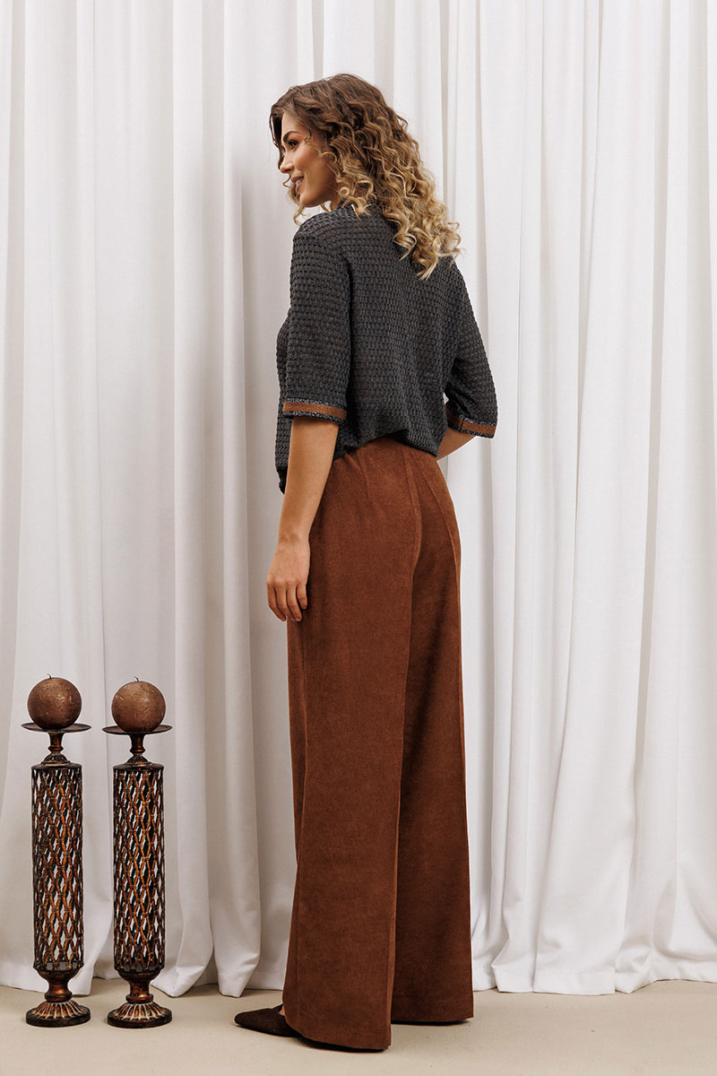 Брюки палаццо с притачным поясом из мягкой вельветовой ткани. Спереди застежка гульфик на молнии и петлей и пуговицей по поясу. По задней частям брюк вытачки. Пояс с резинкой в боковых частях. Брюки с заутюженными стрелками.