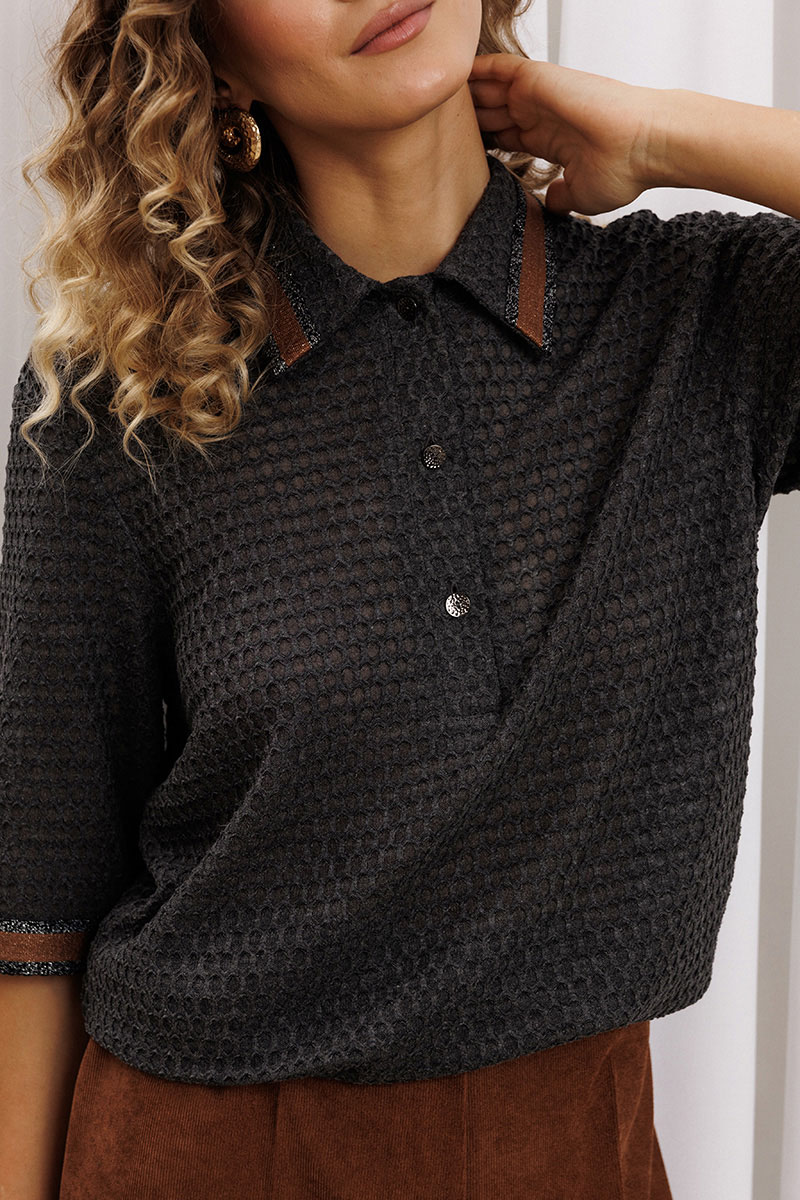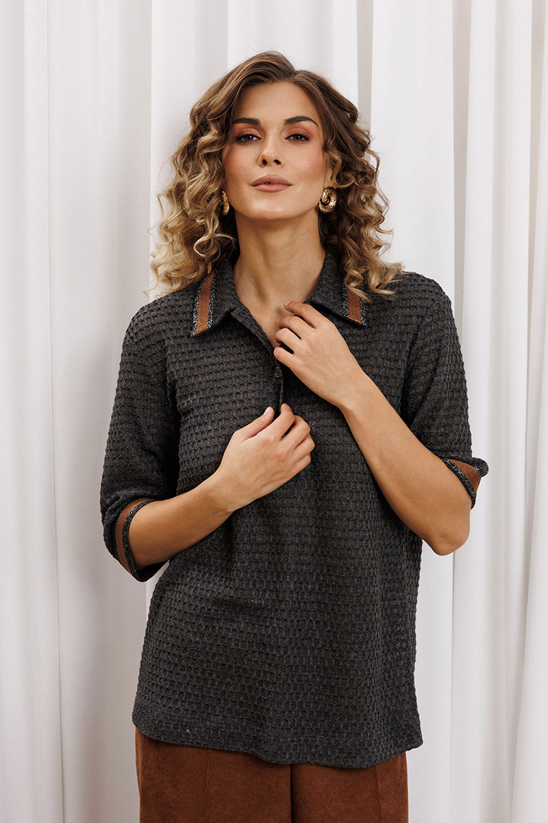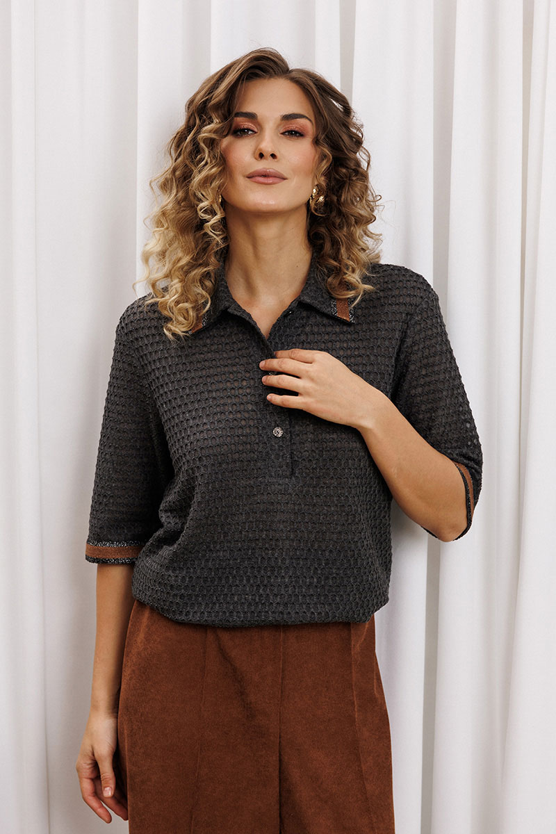 Джемпер прямого силуэта из трикотажного ажурного полотна. Перед с застежкой поло и нагрудными вытачками. По воротнику и низу рукава настрочена декоративная тесьма.