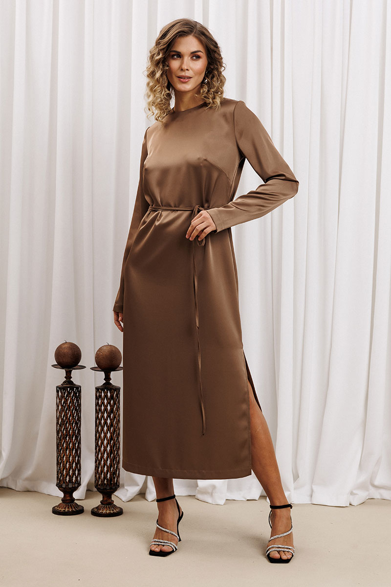 Платье прямого силуэта выполнено из атласной ткани. Перед с нагрудной вытачкой. Спинка с застежкой "капелькой" на петлю и пуговицу сверху. В боковом шве разрез. Рукав втачной одношовный. К платью прилагается пояс из основной ткани.