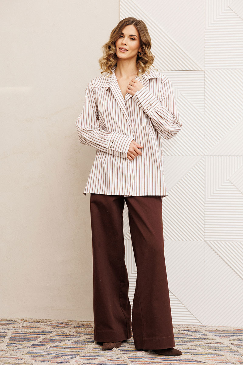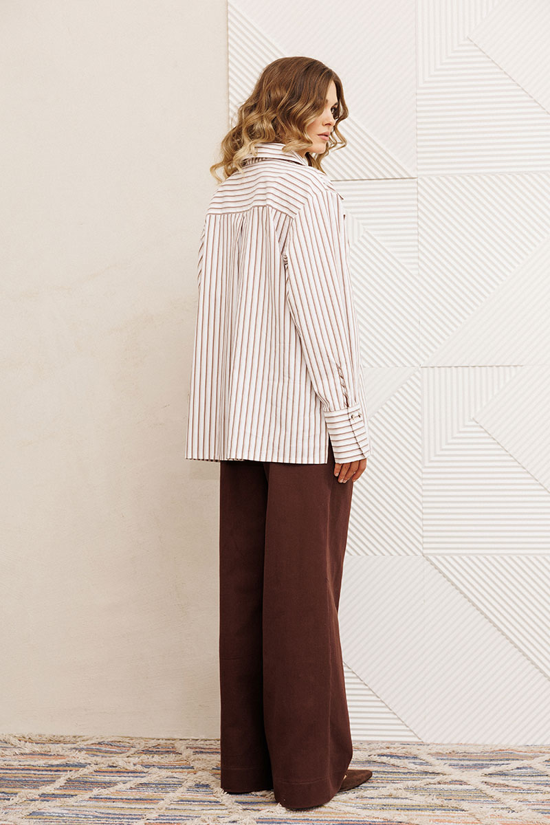 Рубашка свободного силуэта из хлопковой ткани в полоску. Перед с двубортной застежкой и карманом в районе груди. Воротник со стойкой. Спинка с кокеткой и складкой. Рукав втачной рубашечный с высокой манжетой на 2 петли и пуговицы.