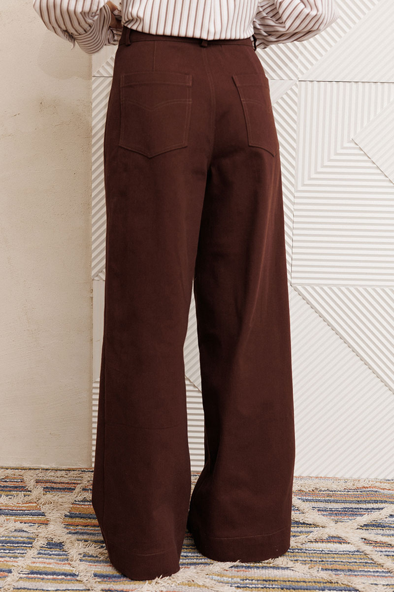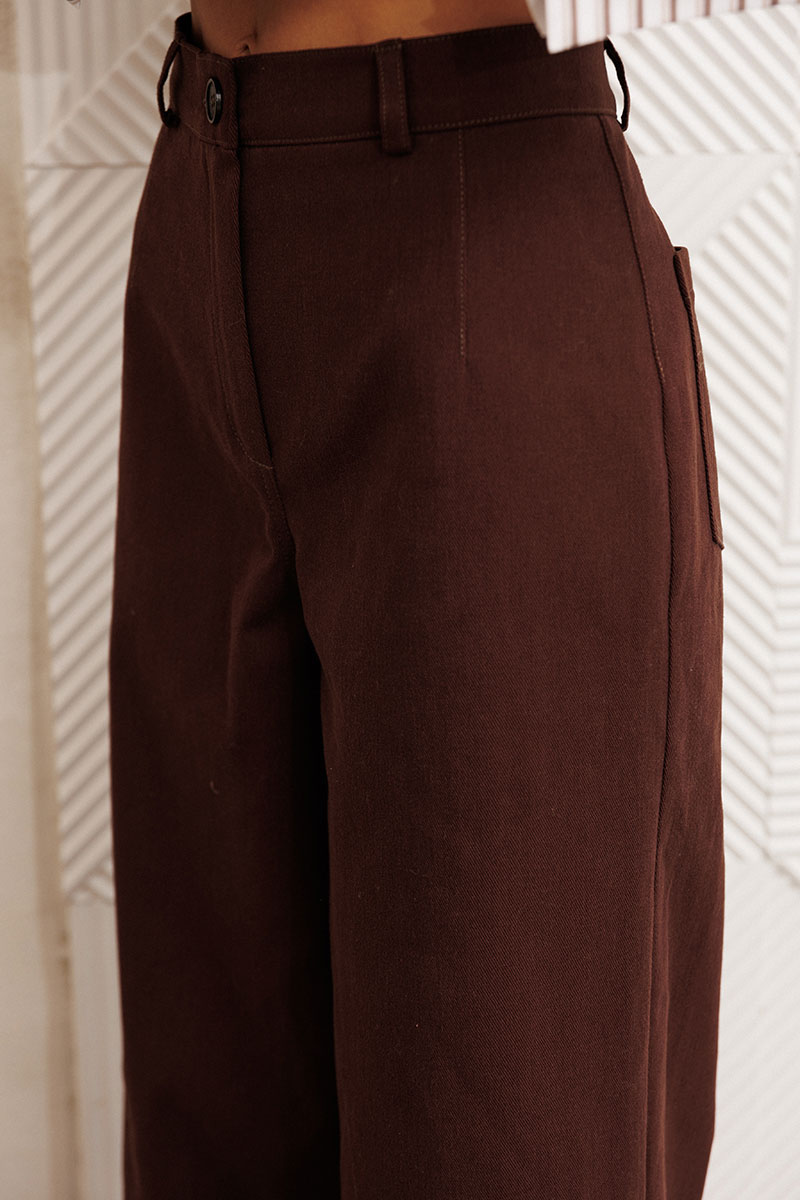 Брюки расширеные книзу на притачном поясе из джинсовой хлопковой ткани. По поясу настрочены шлевки. По передним и задним частям брюк вытачки. На задних частях брюк настрочены карманы. Карманы, вытачки, пояс, низ брюк отделаны отделочной строчкой.