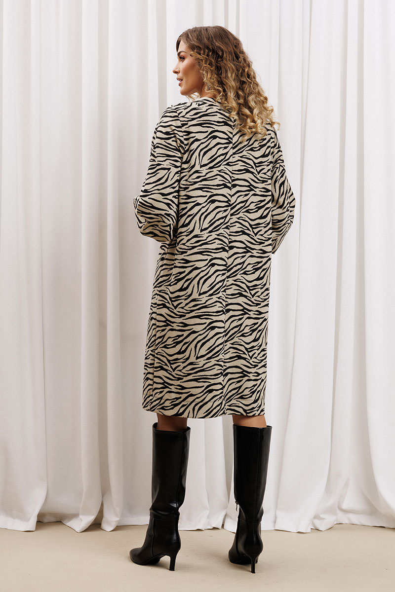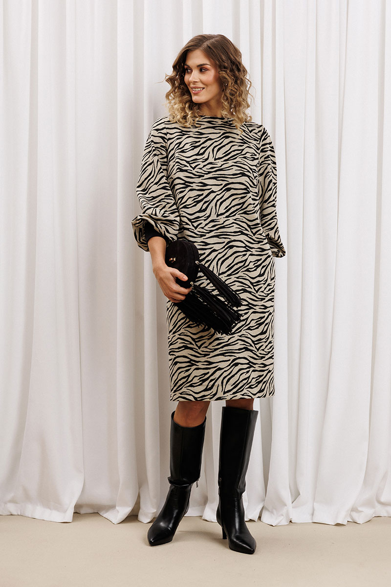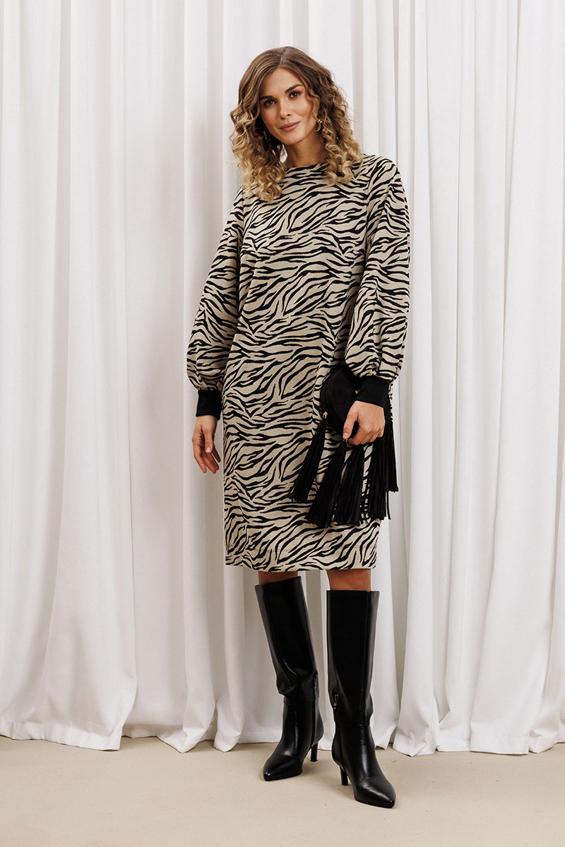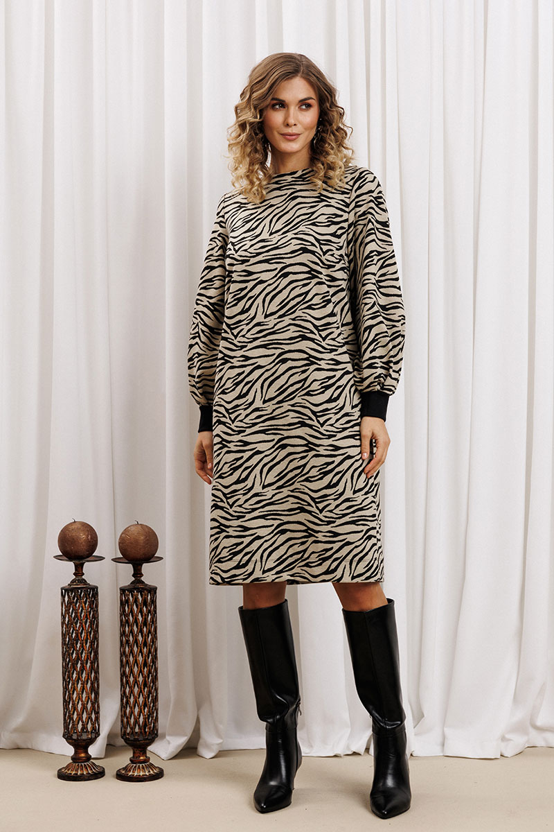Платье прямого силуэта из плотного трикотажного полотна. Перед с нагрудными вытачками. Спинка со средним швом. Горловина лодочкой обработана планкой. Рукав одношовный втачной по низу со складками собранными на манжету-довяз.