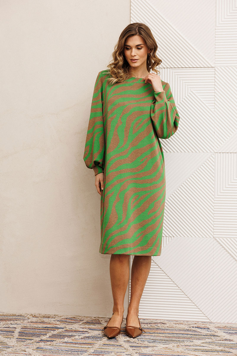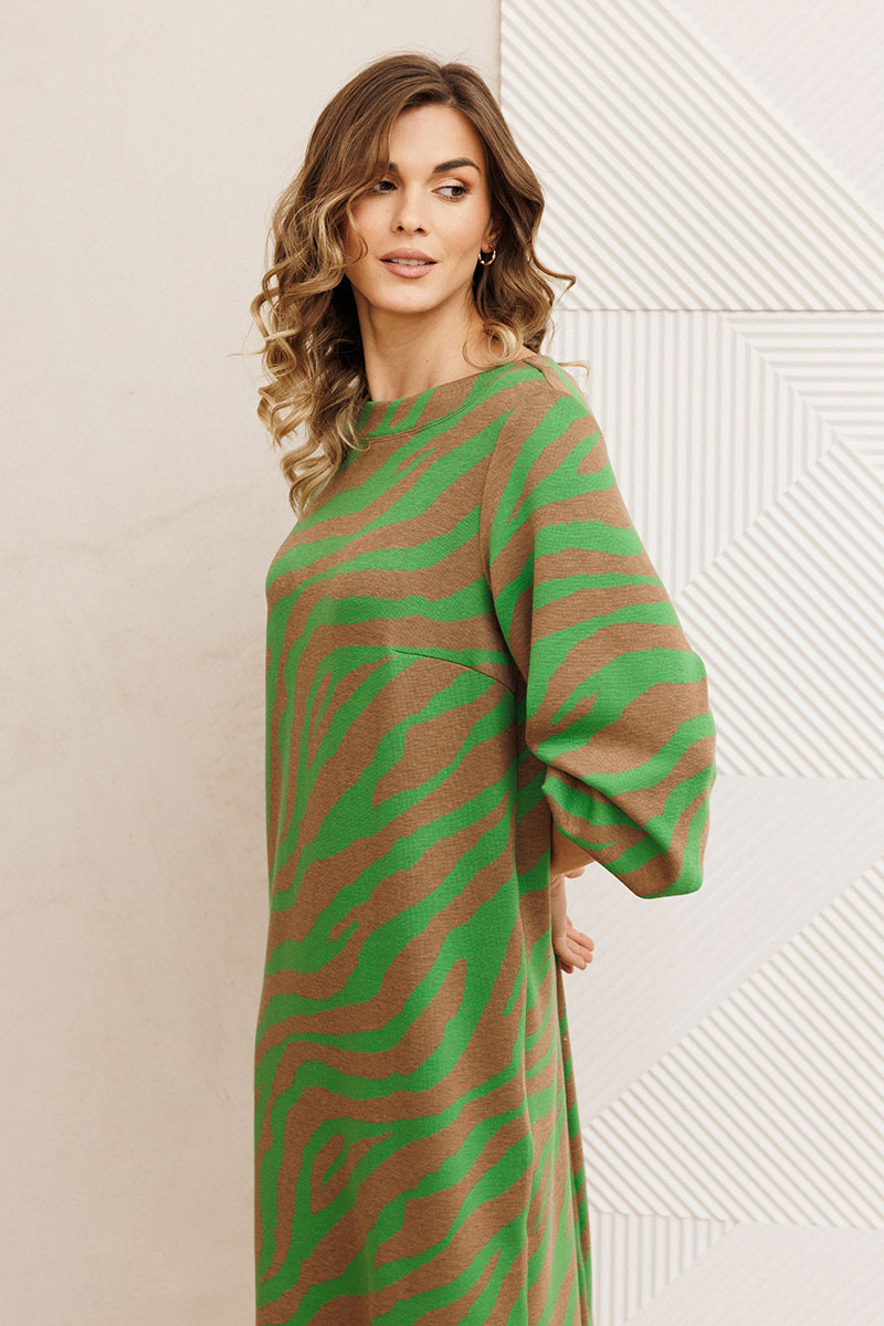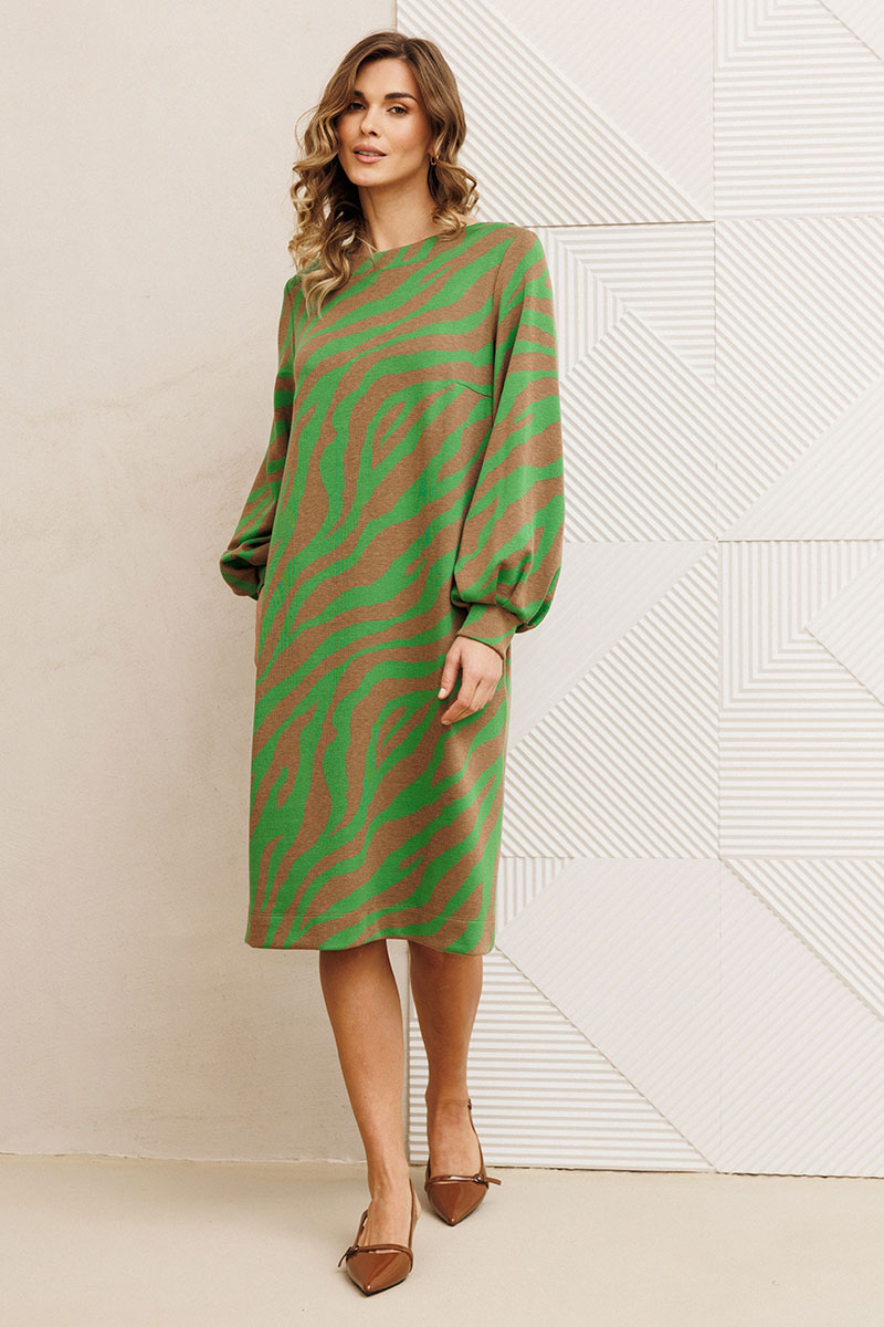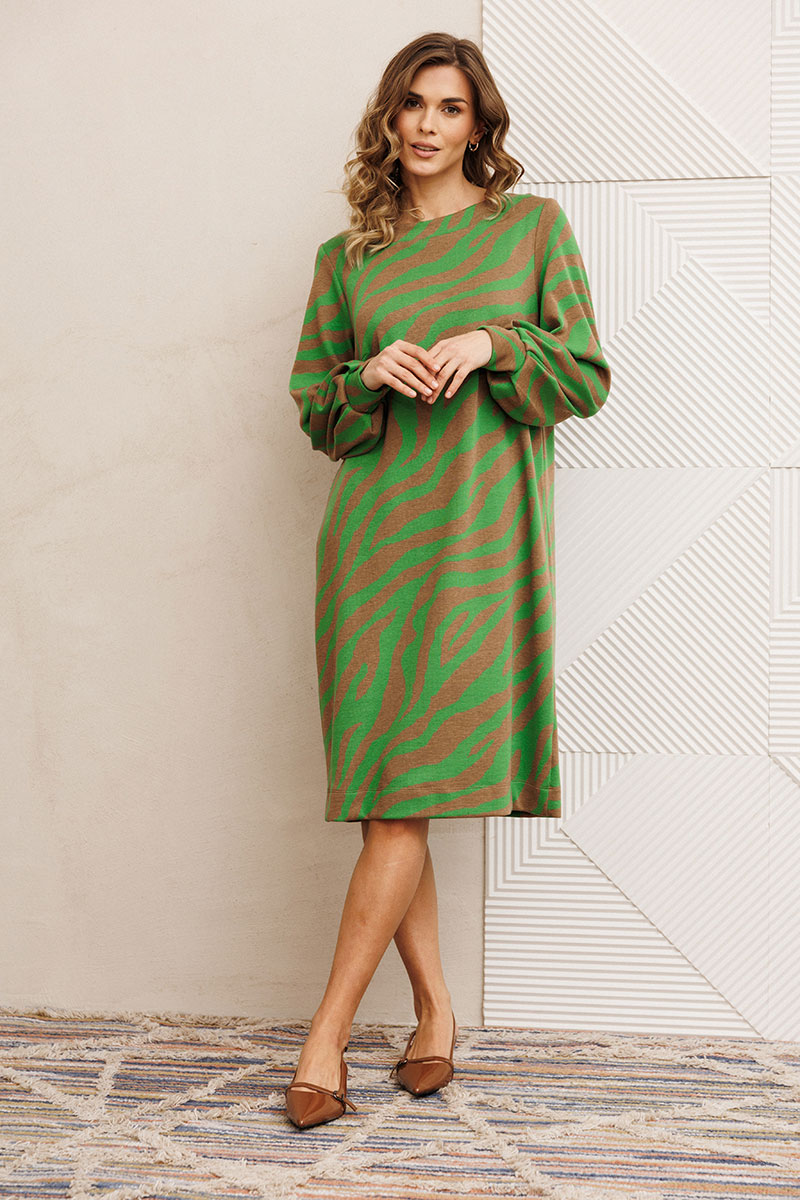 Платье от GIZART выполнено из плотного трикотажа, что обеспечивает комфорт и долговечность. Коллекция бренда сочетает стиль и удобство, предлагая платье с прямым силуэтом и длиной миди, идеально подходящее для осенне-зимнего сезона. Оригинальный тигриный принт создает эффектный образ, привлекая внимание. Декоративные складки на манжете придают изысканность, а горловина в виде лодочки подчеркивает женственность. Этот предмет гардероба универсален: его можно носить ежедневно или же выбрать в качестве офисного наряда. Бежево-зеленая цветовая гамма легко комбинируется с аксессуарами, позволяя создавать разнообразные образы.