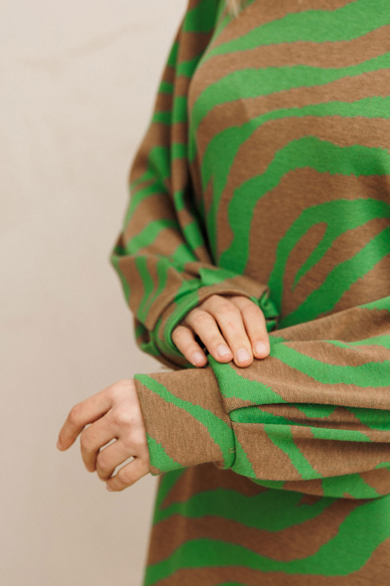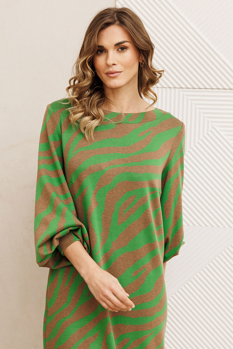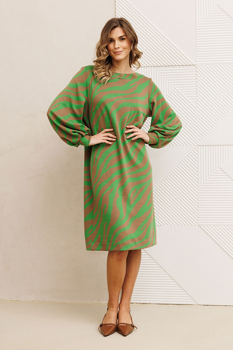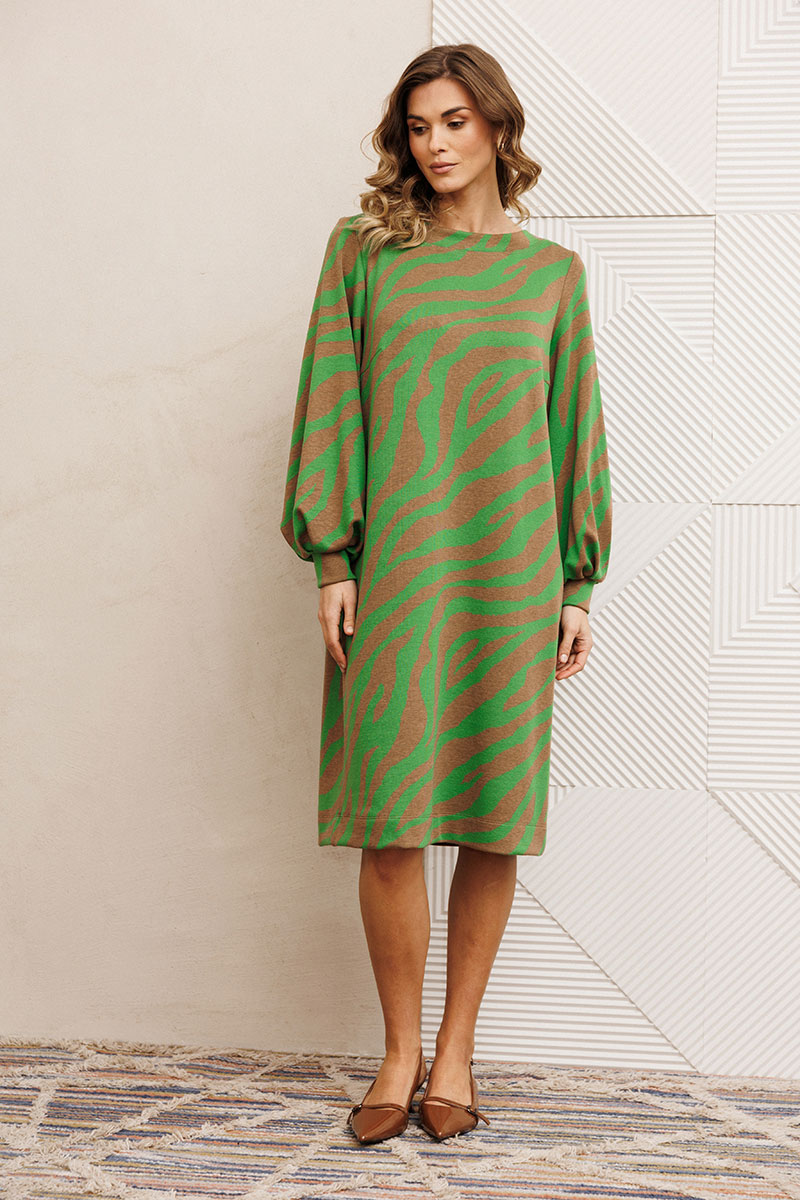 Платье от GIZART выполнено из плотного трикотажа, что обеспечивает комфорт и долговечность. Коллекция бренда сочетает стиль и удобство, предлагая платье с прямым силуэтом и длиной миди, идеально подходящее для осенне-зимнего сезона. Оригинальный тигриный принт создает эффектный образ, привлекая внимание. Декоративные складки на манжете придают изысканность, а горловина в виде лодочки подчеркивает женственность. Этот предмет гардероба универсален: его можно носить ежедневно или же выбрать в качестве офисного наряда. Бежево-зеленая цветовая гамма легко комбинируется с аксессуарами, позволяя создавать разнообразные образы.