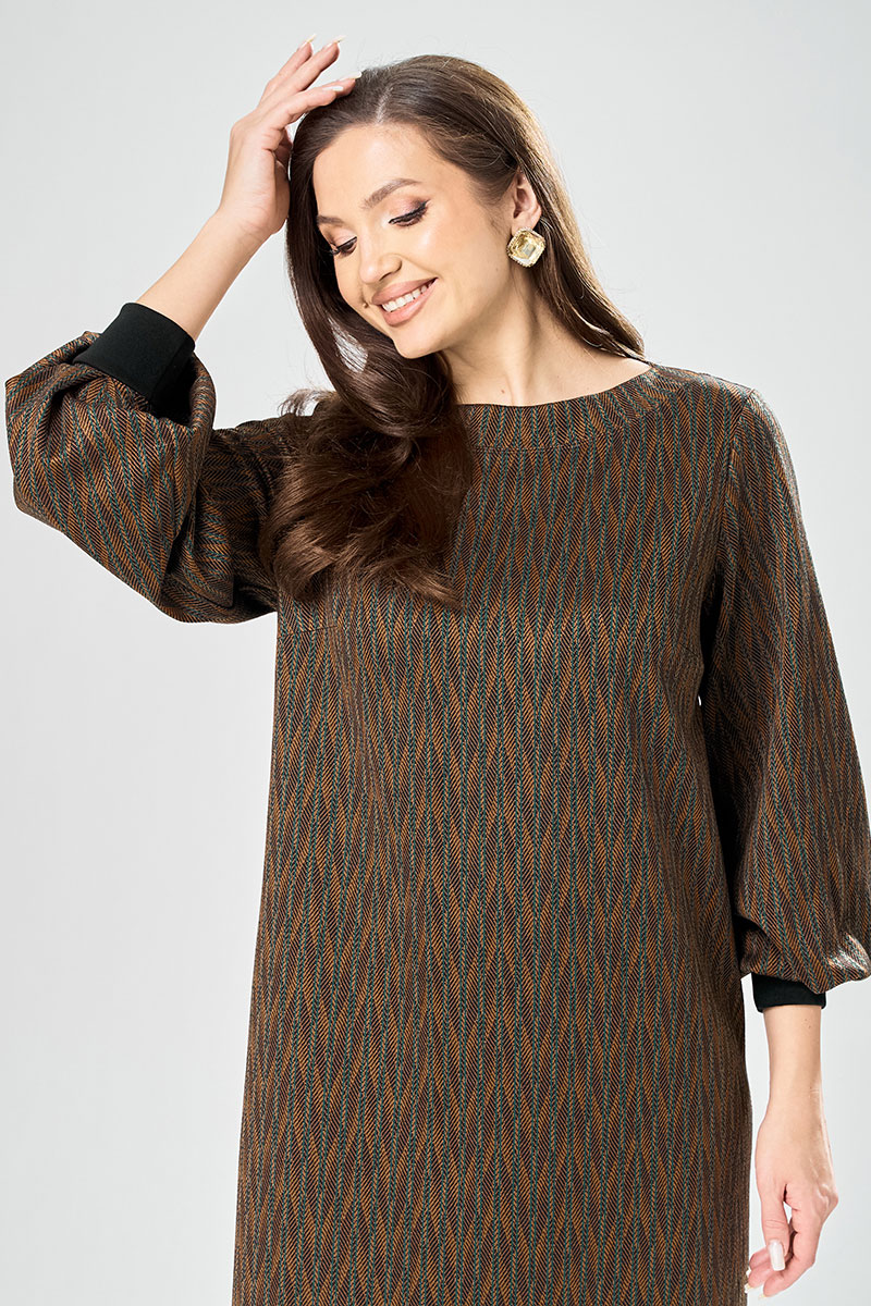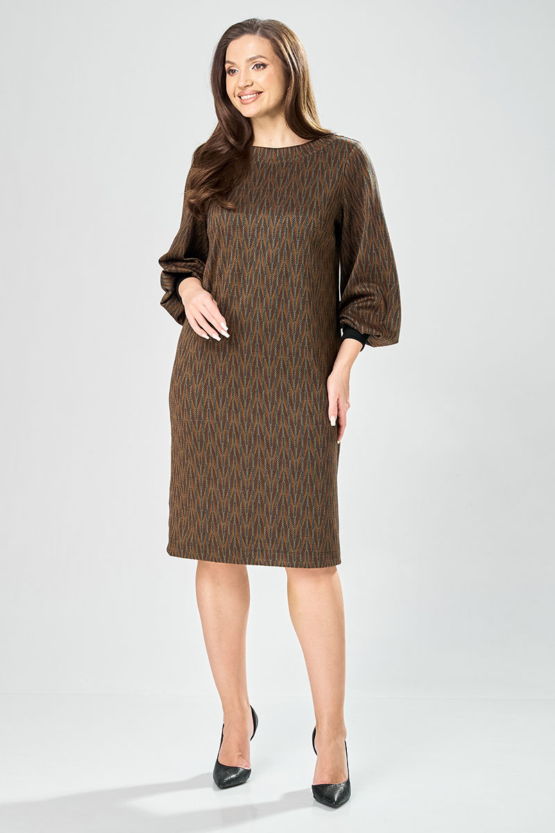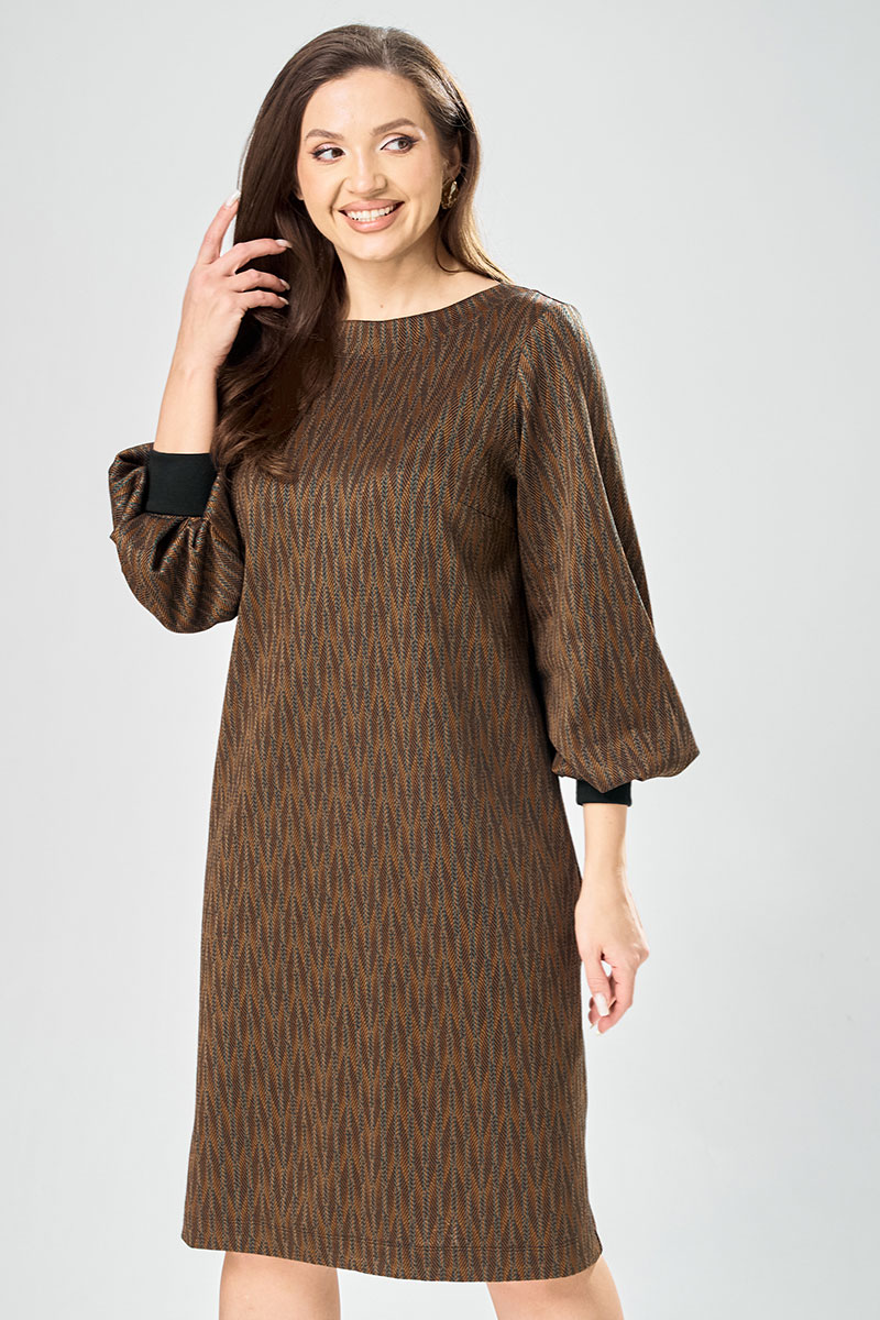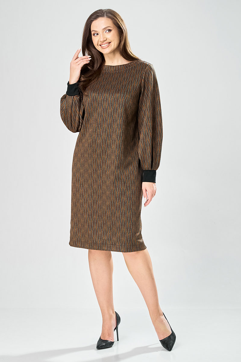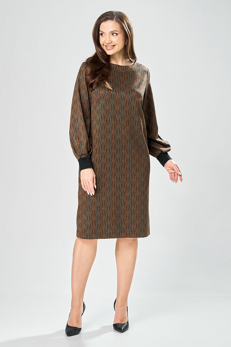 Платье прямого силуэта из плотного трикотажного полотна с рисунком. Перед с нагрудными вытачками. Спинка со средним швом. Горловина лодочкой обработана планкой. Рукав одношовный втачной по низу со складками собранными на манжету. В боковом шве карман.