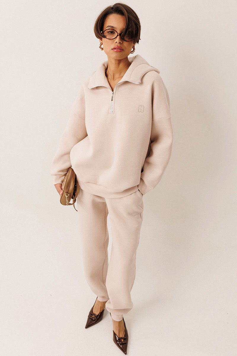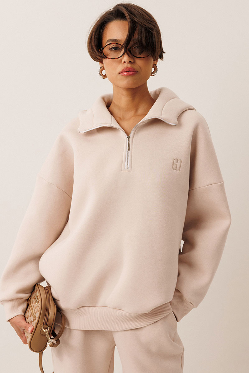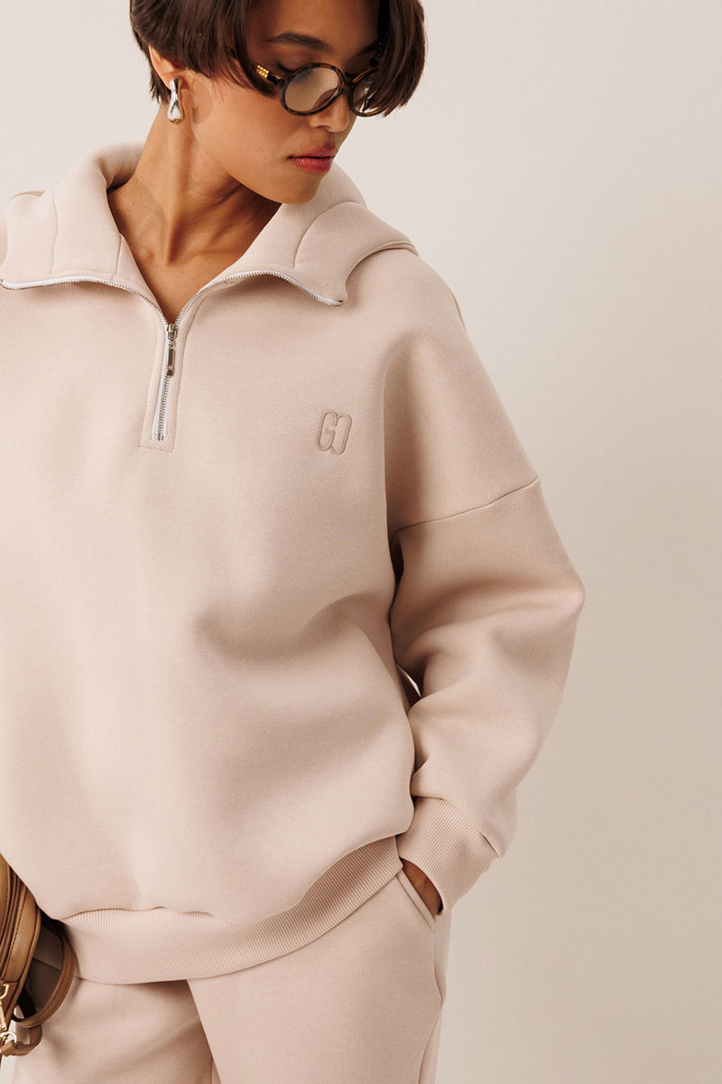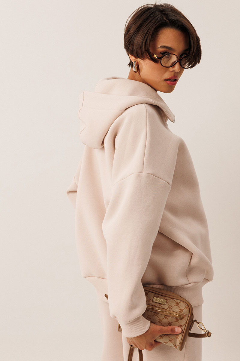 Джемпер имеет двойной капюшон и короткую застежку - молнию черного контрастного цвета по центру переда. На переде с левой стороны выполнена вышивка в цвет ткани. Джемпер имеет прямой силуэт. Низ джемпера и манжеты выполнены из кашкорсе.