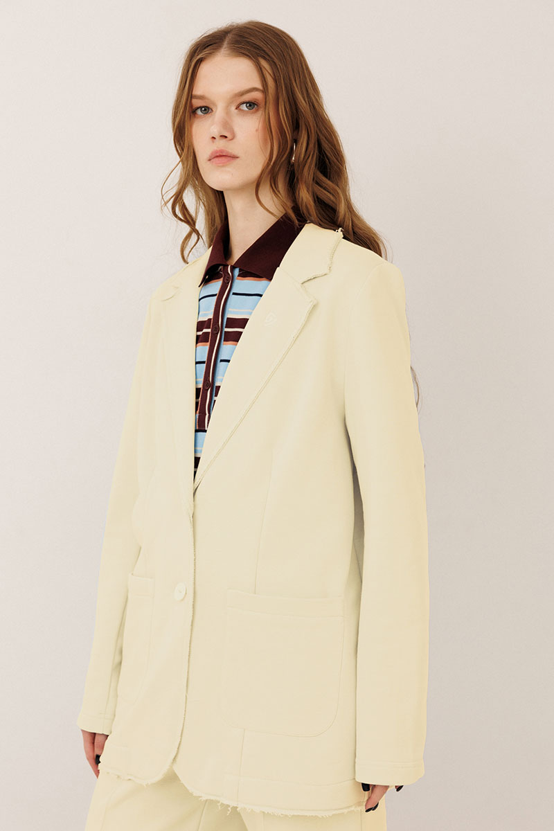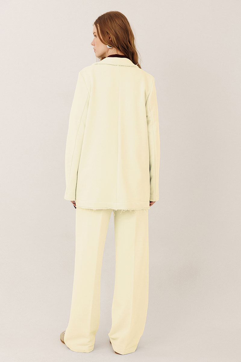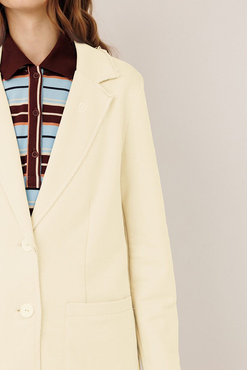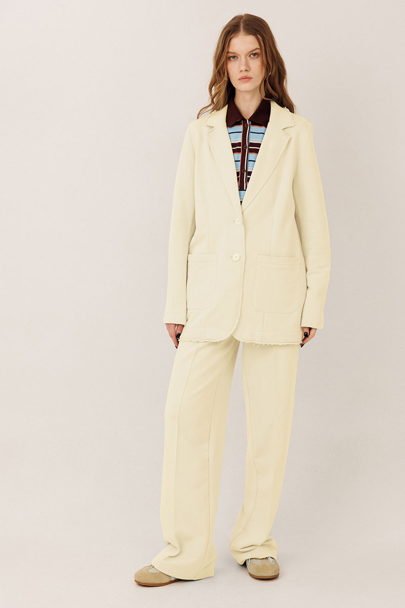 Костюм Gowear из футера в стиле smart casual поможет создать в меру строгий и одновременно расслабленный образ. Костюм состоит из жакета и прямых брюк. Жакет прямого силуэта с воротником и лацканами, имеет удобные карманы и застежку на 2 пуговицы. На левом лацкане вышивка-логотип в контрастном цвете. Низ и борта имеют открытые края (эффект необработанного шва), укреплены дополнительной строчкой. Жакет без подкладки. Брюки прямые. На передних половинках - отделочная строчка по стрелкам и удобные боковые карманы. Пояс из ткани кошкорсе, с резинкой и контрастным шнурком.