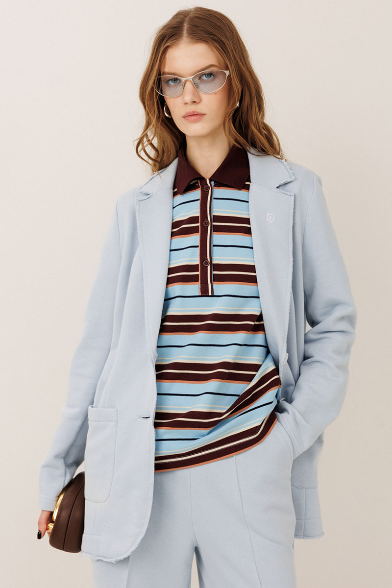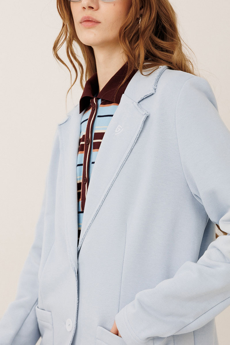 Жакет прямого силуэта с воротником и лацканами, имеет удобные карманы и застежку на 2 пуговицы. На левом лацкане вышивка-логотип в контрастном цвете. Низ и борта имеют открытые края (эффект необработанного шва), укреплены дополнительной строчкой. Жакет без подкладки.