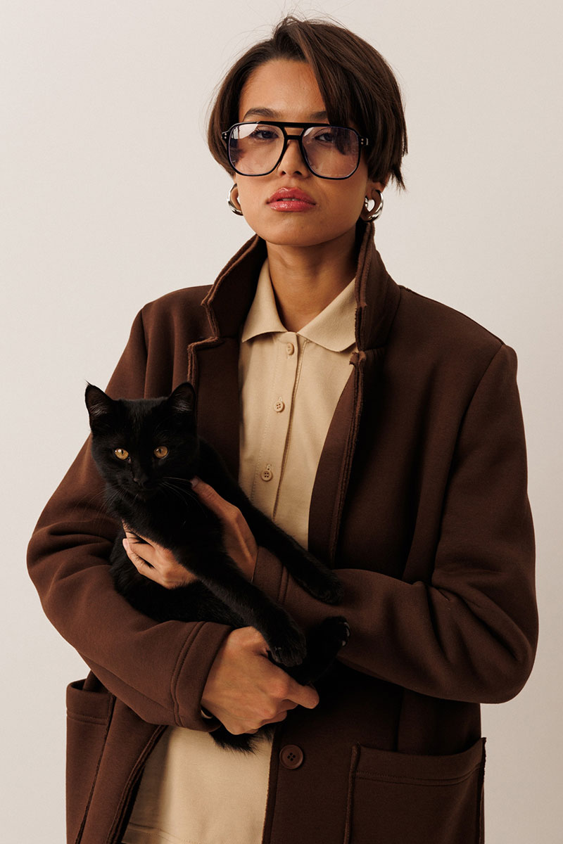 Жакет прямого силуэта с пиджачным воротником, имеет удобные накладные карманы и застежку на 2 пуговицы. На левом лацкане вышивка-логотип в цвет ткани. Низ и борта имеют открытые края
