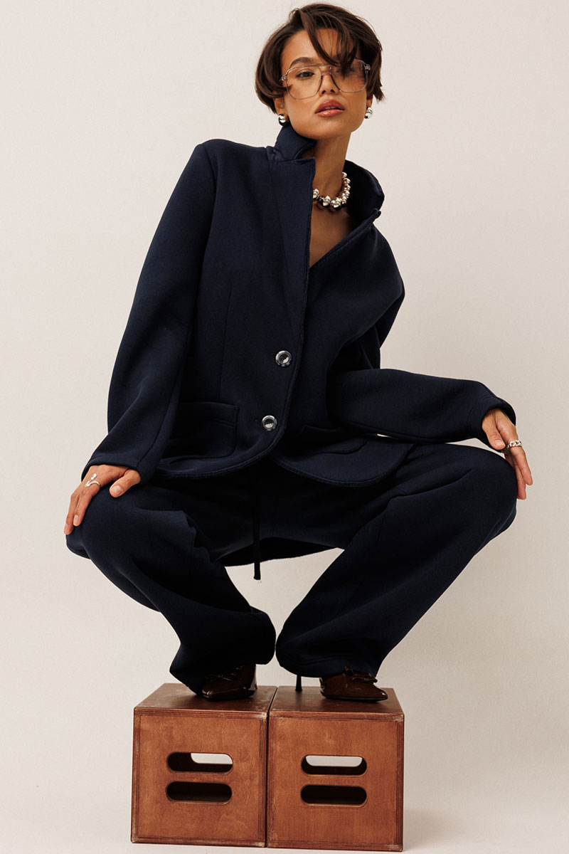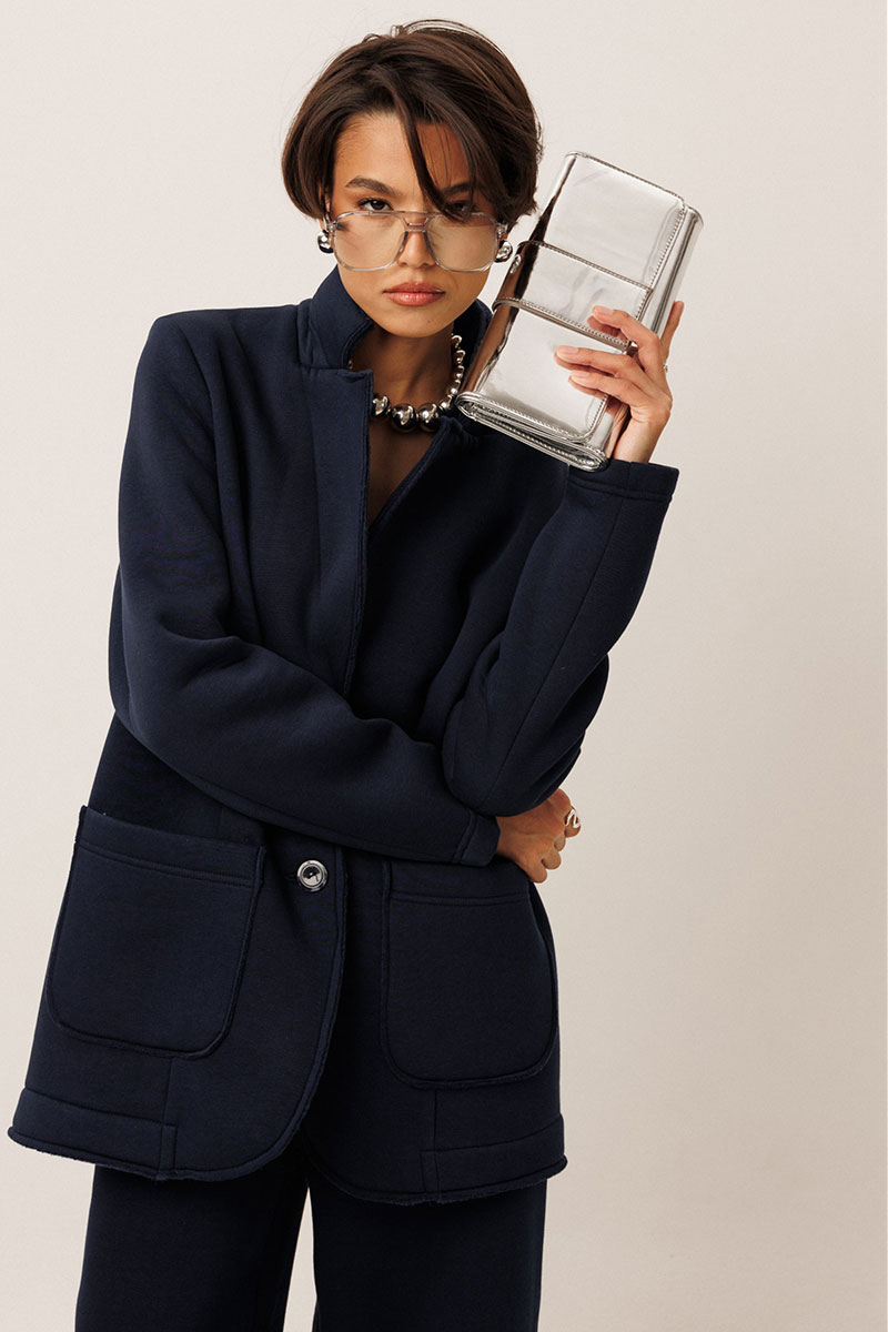 Жакет в стиле smart casual. Жакет прямого силуэта с пиджачным воротником, имеет удобные накладные карманы и застежку на 2 пуговицы. На левом лацкане вышивка-логотип в цвет ткани. Низ и борта имеют открытые края (эффект необработанного шва), укреплены дополнительной строчкой. Жакет без подкладки.