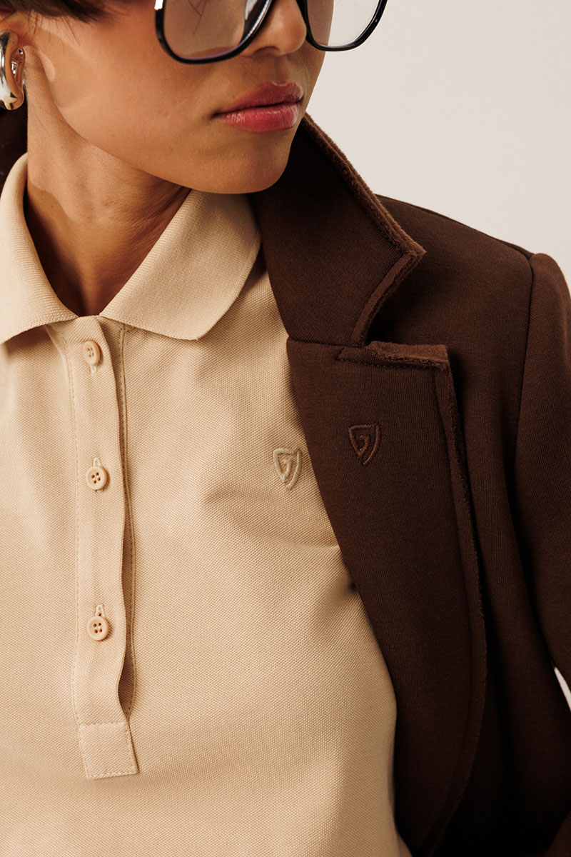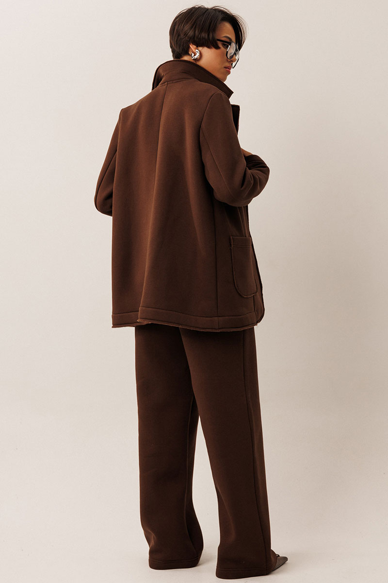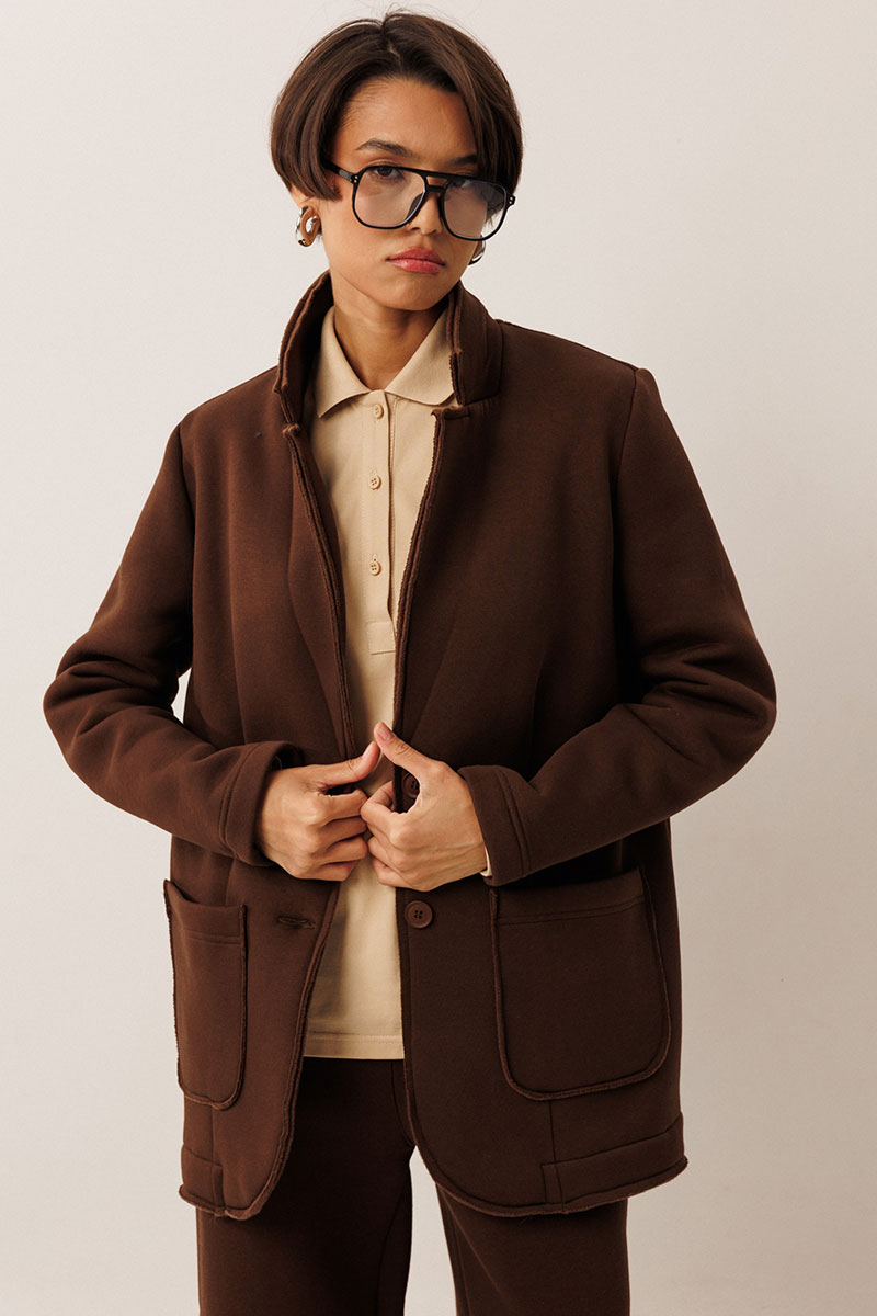 Жакет в стиле smart casual. Жакет прямого силуэта с пиджачным воротником, имеет удобные накладные карманы и застежку на 2 пуговицы. На левом лацкане вышивка-логотип в цвет ткани. Низ и борта имеют открытые края (эффект необработанного шва), укреплены дополнительной строчкой. Жакет без подкладки.