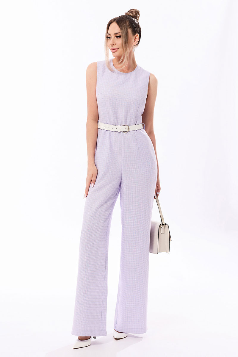 Комбинезон с застежкой на потайную молнию с среднем шве спинки, без рукавов. По верхней части переда нагрудные и талиевые вытачки. В боковых швах нижней части комбинезона выполнены карманы . Спинка со средним швом, талиевыми вытачками. Шов по талии присборен на резинку. Комбинезон со съемным поясом. По боковым швам расположены шлевки для пояса.