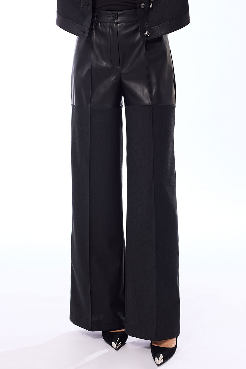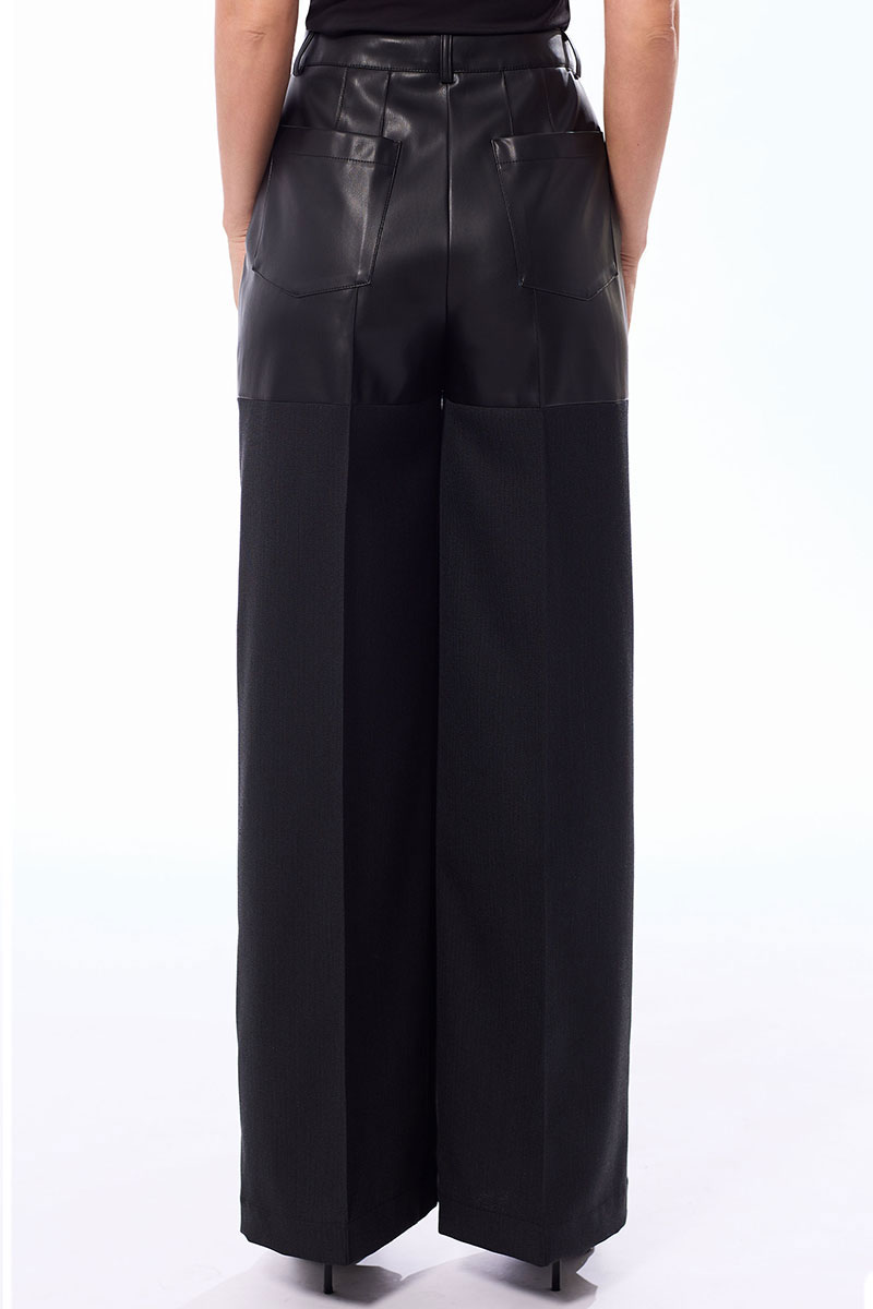 Брюки с отрезным поясом, застежка-гульфик, пояс застегивается на одну пуговицу. Передние половинки с карманами. Вход в карман наклонный к боковому шву. Задние половинки с накладными карманами, талиевыми вытачками. Пояс со шлевками. Передние и задние половинки состоят из двух деталей. Верхние части брюк, накладные карманы и пояс из кожзама.