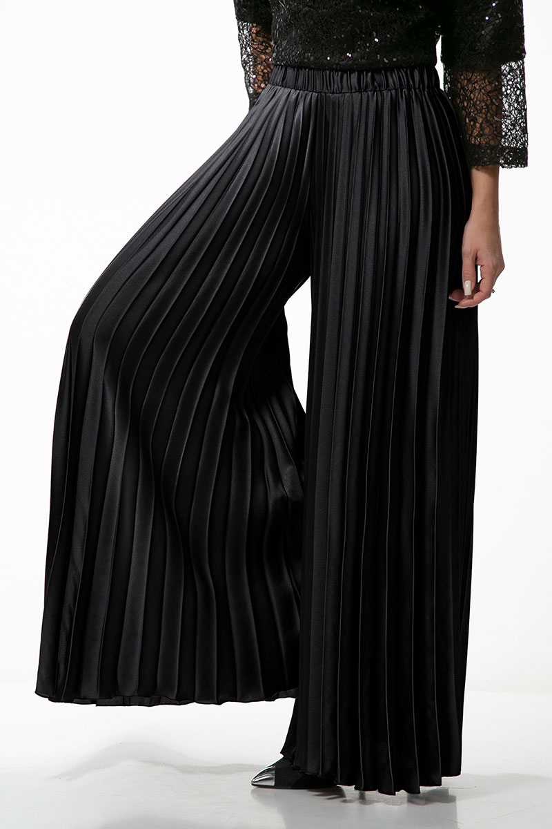 Брюки-гофре расширенного силуэта, с отрезным поясом, без застежки, верх брюк присборен на резинку. Брюки без боковых швов.