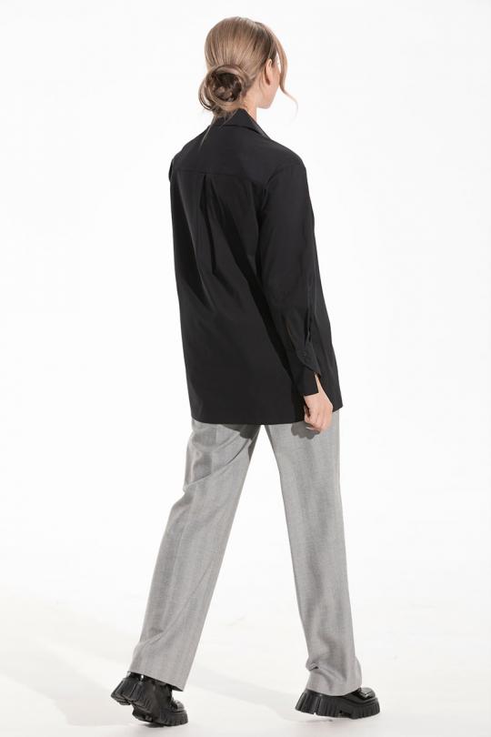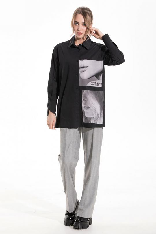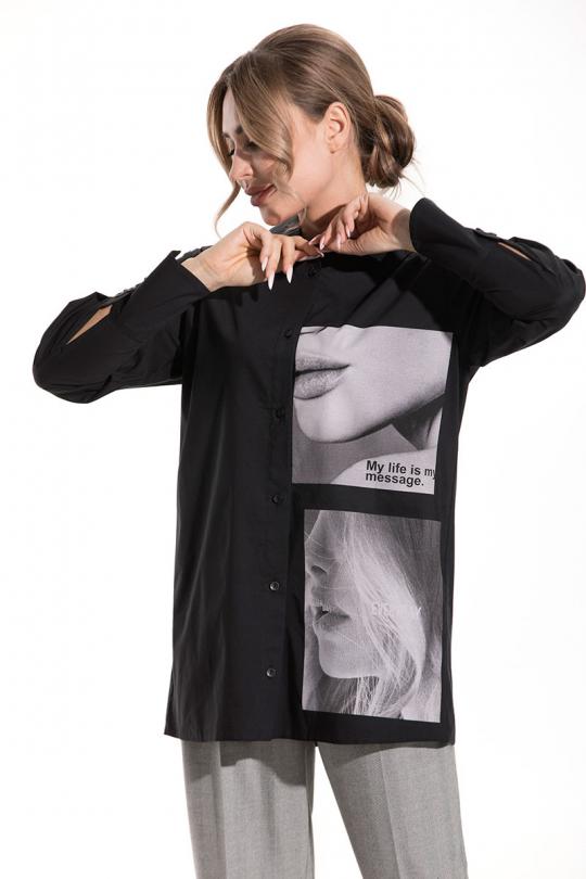Блузка удлиненная, в стиле оверсайз, с втачным воротником с отрезной стойкой, центральной застежкой на петли и пуговицы. Спинка с отрезной кокеткой, встречной складкой по шву притачивания кокетки. Плечевые швы, переходящие на перед. Низ блузки фигурный. Рукав втачной, длинный, с отрезной манжетой. Полочка декорирована печатью.