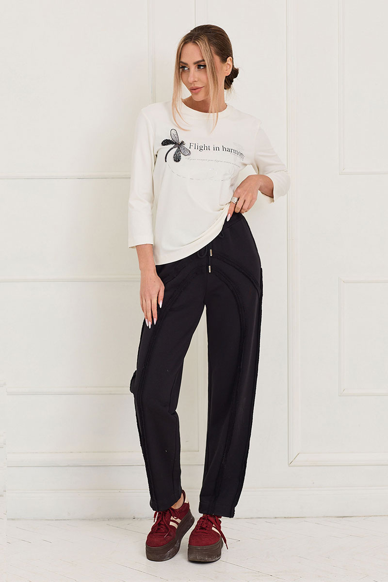 Блузка трикотажная с планкой по горловине, с круглым вырезом горловины. Перед и спинка цельные. Рукав втачной, 3/4.