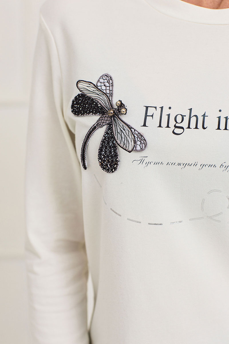 Цветовая гамма для верха, подкладки, фурнитуры, отделки: блузка выполнена из ткани в одной цветовой гамме. Перед декорирован печатью и декоративной брошью.