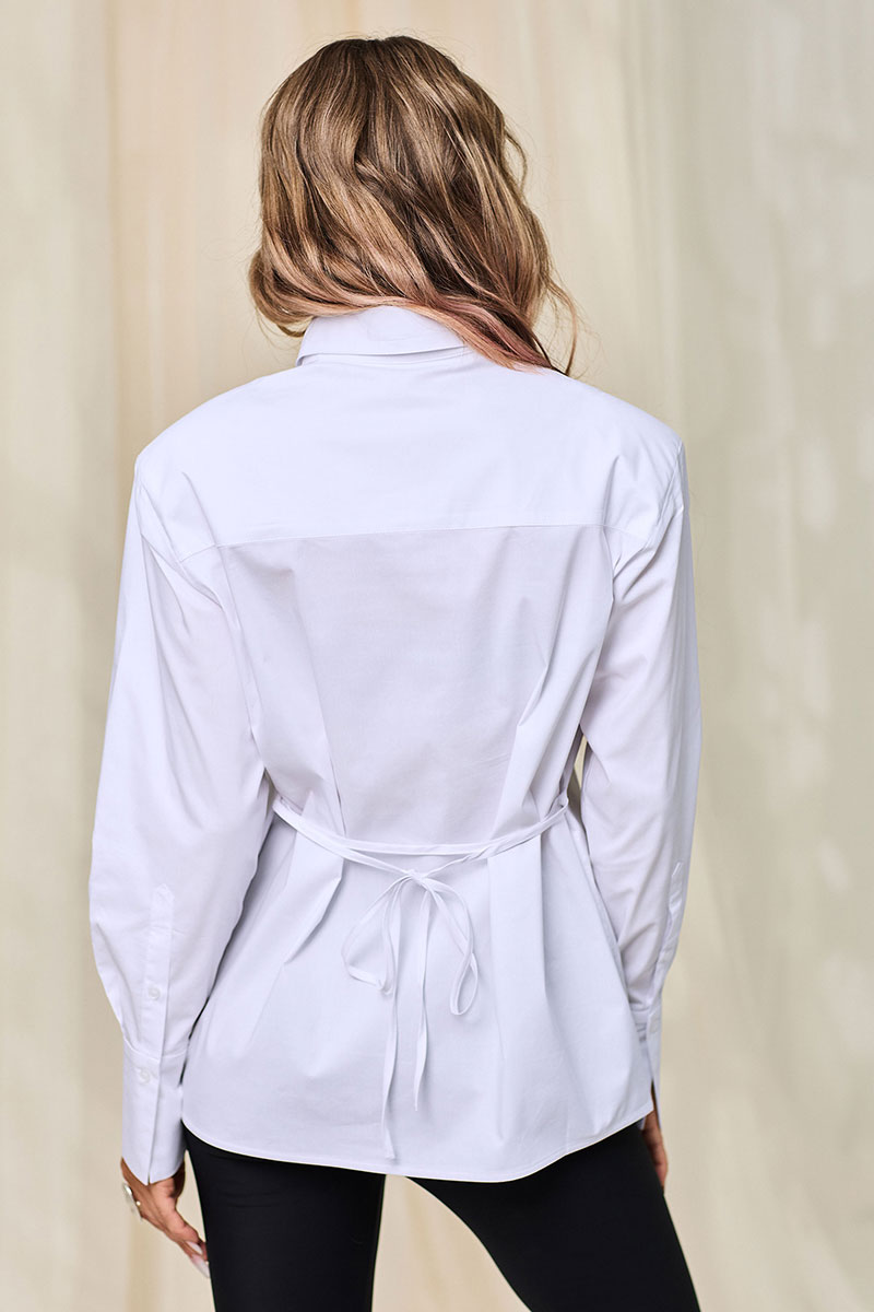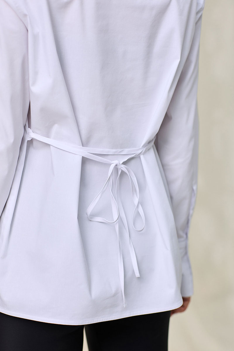 Блузка, с центральной потайной застежкой на петли и пуговицы по планке переда, с втачным воротником с отрезной стойкой. Плечевой шов переходит на перед. По спинке с отрезной кокеткой. Рукав втачной, длинный, с отрезной манжетой. Манжета застегивается на одну петлю и пуговицу. Блузка со съемным пояском. По боковым швам расположены шлевки для пояса.