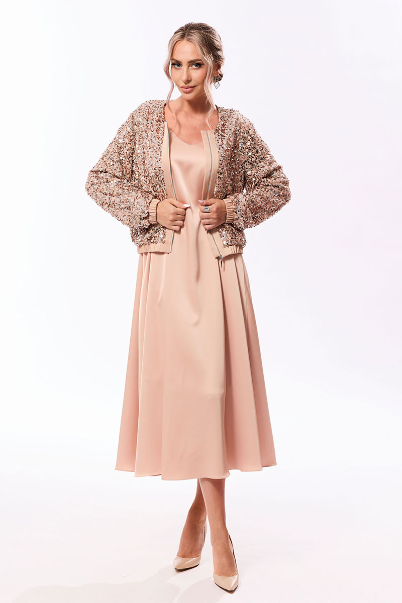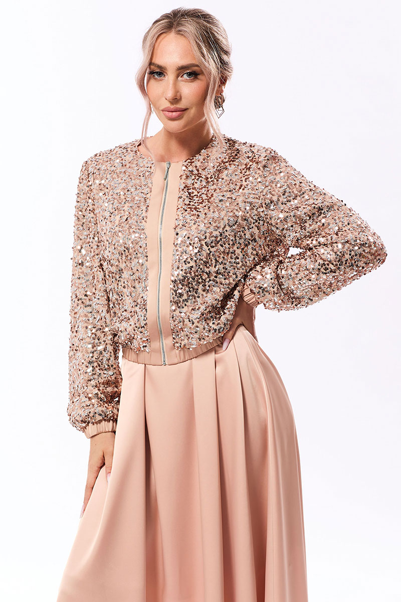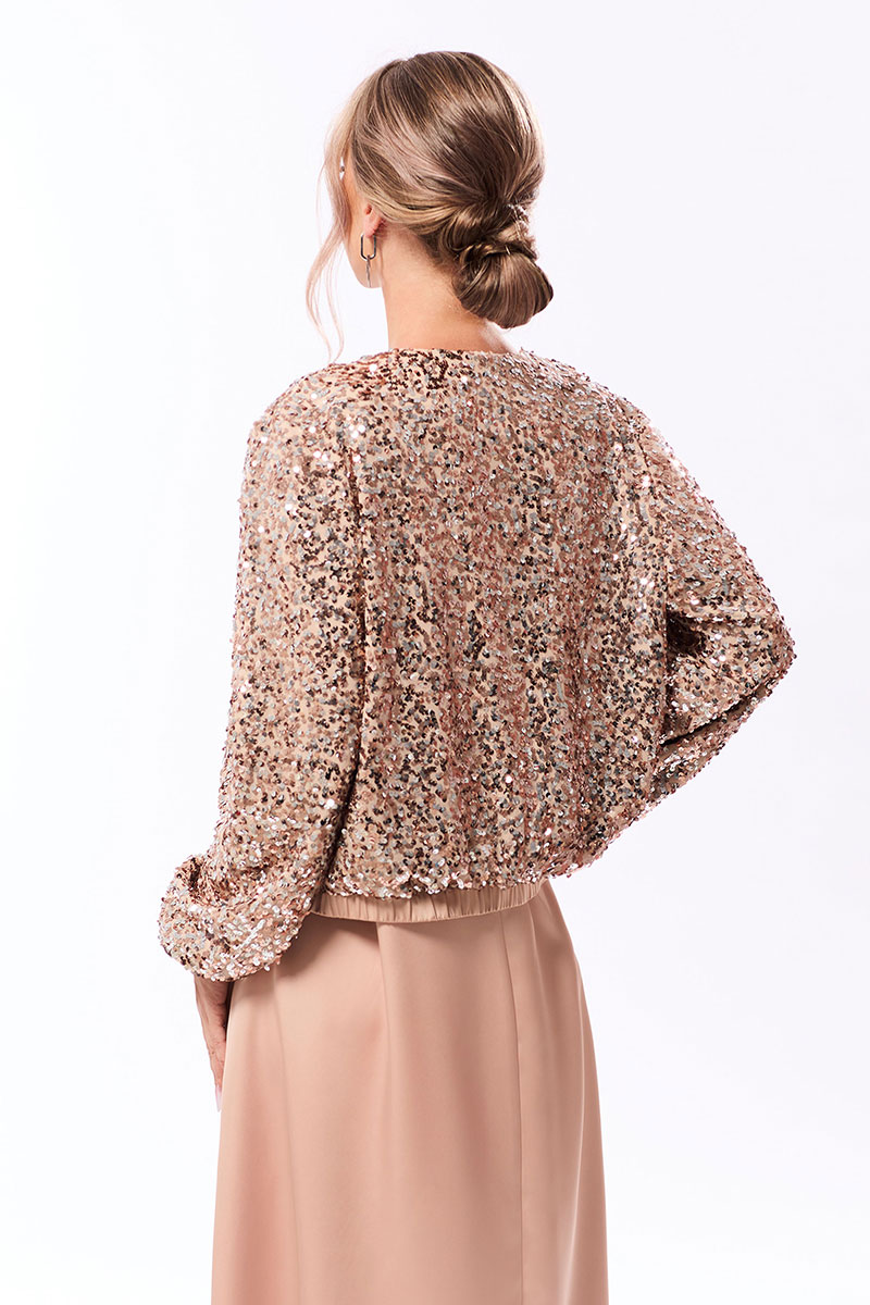 Цветовая гамма для верха, подкладки, фурнитуры, отделки: Жакет выполнен из ткани с пайетками