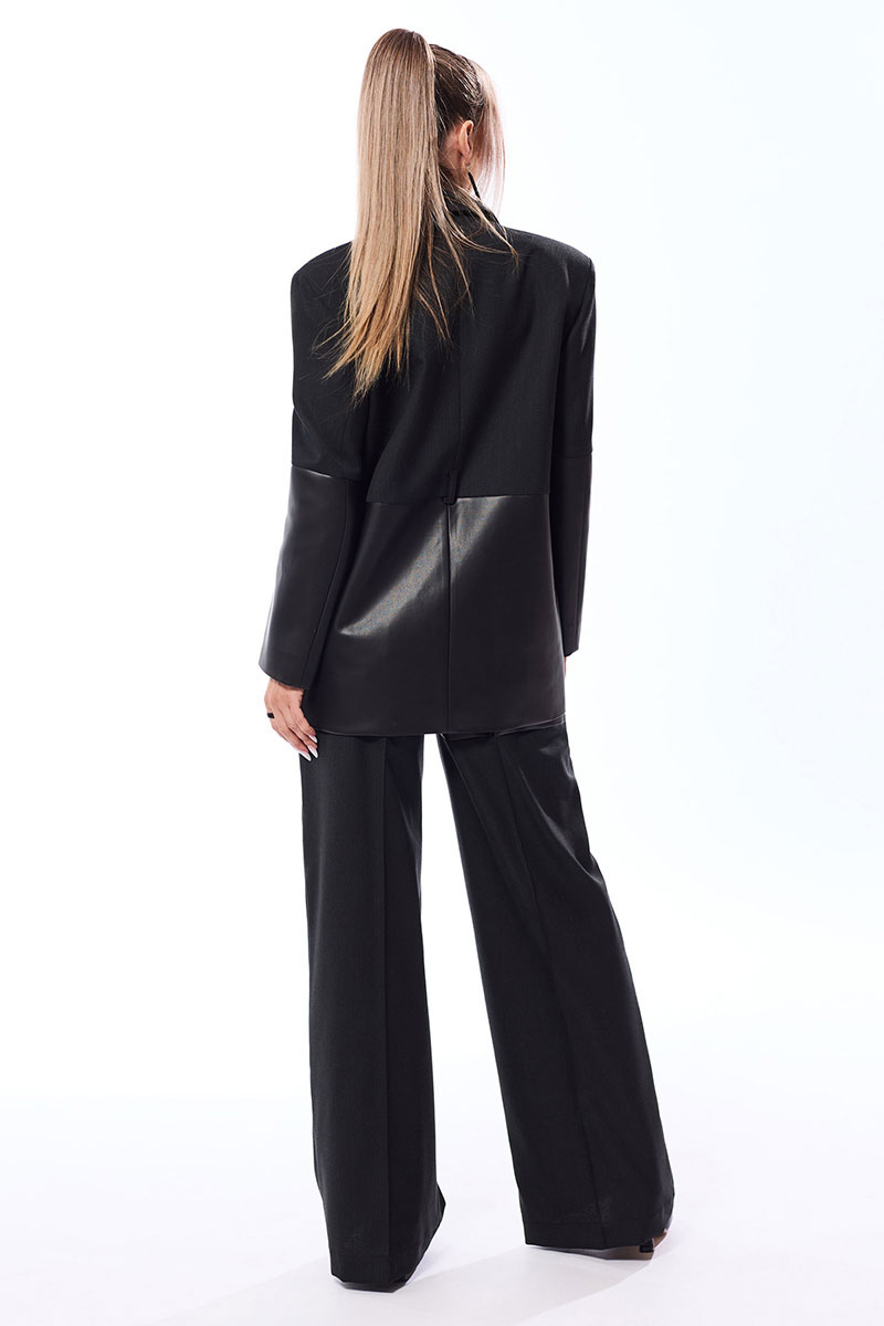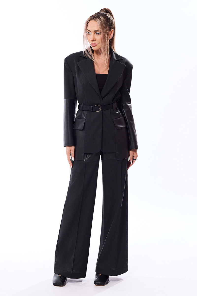 Жакет с центральной застежкой на петлю и пуговицу, втачным воротником и лацканом пиджачного типа. По переду с настрочными клапанами, талиевыми вытачками. Жакет отрезной по линии талии По спинке со средним швом . Рукав втачной, длинный, состоит из двух частей. Жакет со съемным поясом, на уровне линии талии расположены шлевки для пояса. Линия низа фигурная. Нижняя часть жакета, нижняя часть рукава, клапаны- из кожзама.