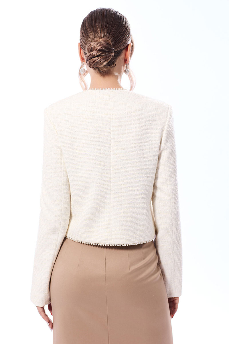 Жакет прямого силуэта с центральной застежкой на петли и пуговицы, без воротника, с круглым вырезом горловины. По переду с нагрудными вытачками. На уровне груди и линии талии расположены настрочные клапаны . Спинка со средним швом. Рукав втачной, длинный. Вдоль линии борта, горловины и клапанов- декоративная тесьма с бусинами.