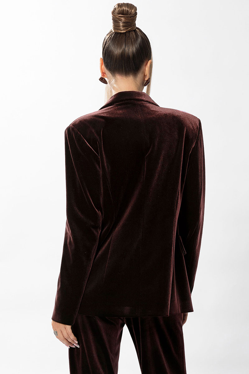 Описание внешнего вида: жакет прямого силуэта с центральной двубортной застежкой на петли и пуговицы, с втачным воротником и отложными лацканами пиджачного типа. По переду с рельефами, выходящими из проймы. На уровне линии талии расположены настрочные клапаны. Спинка со средним швом, рельефами, выходящими из проймы. Рукав втачной, длинный.