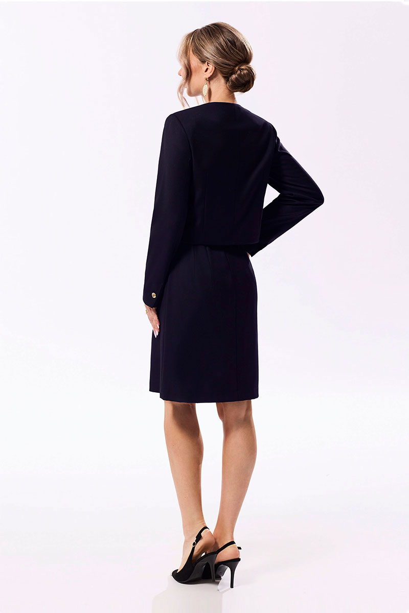 Жакет с центральной застежкой на петли и пуговицы, без воротника. По переду с талиевыми вытачками. Спинка со средним швом,талиевыми вытачками. Рукав втачной, длинный со шлицей и застежкой на петлю и пуговицу.