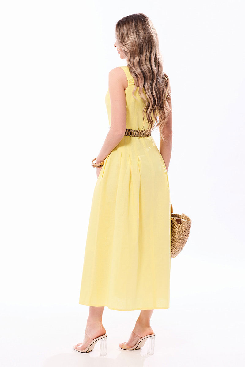 Платье, с застежкой на потайную молнию в среднем шве спинки, без воротника, на бретелях. По переду и спинке со средним швом, полурельефами, заканчивающимися встречной складкой. На уровне линии талии расположены шлевки для пояса. Платье со сьемным поясом.