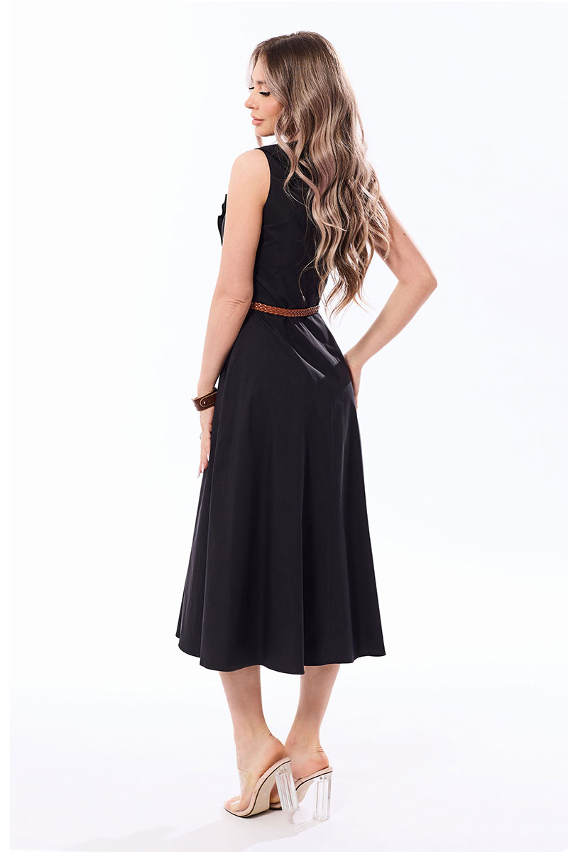 Платье с центральной застежкой на навесные петли и пуговицы по притачной планке, без воротника, без рукавов, с V-образным вырезом горловины. Платье отрезное по линии талии. По лифу переда, вдоль горловины и планки расположена рюша. Лиф спинки с талиевыми вытачками. Нижняя часть спинки со средним швом. По боковым швам расположены шлевки для съемного пояса. Платье со съемным поясом.