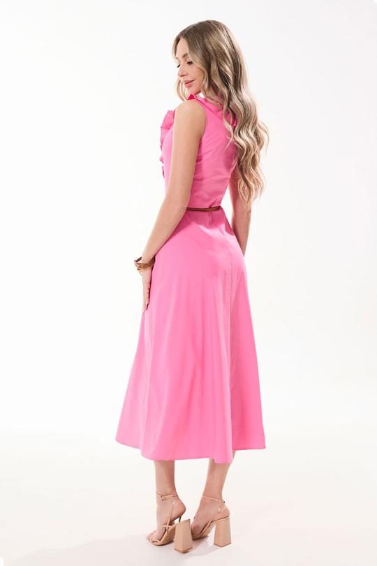 Платье с центральной застежкой на навесные петли и пуговицы по притачной планке, без воротника, без рукавов, с V-образным вырезом горловины. Платье отрезное по линии талии. По лифу переда, вдоль горловины и планки расположена рюша. Лиф спинки с талиевыми вытачками. Нижняя часть спинки со средним швом. По боковым швам расположены шлевки для съемного пояса. Платье со съемным поясом.