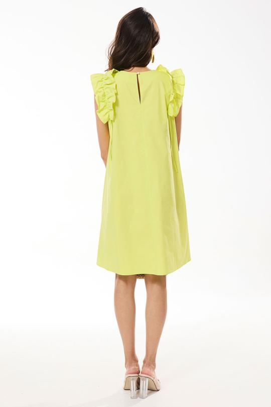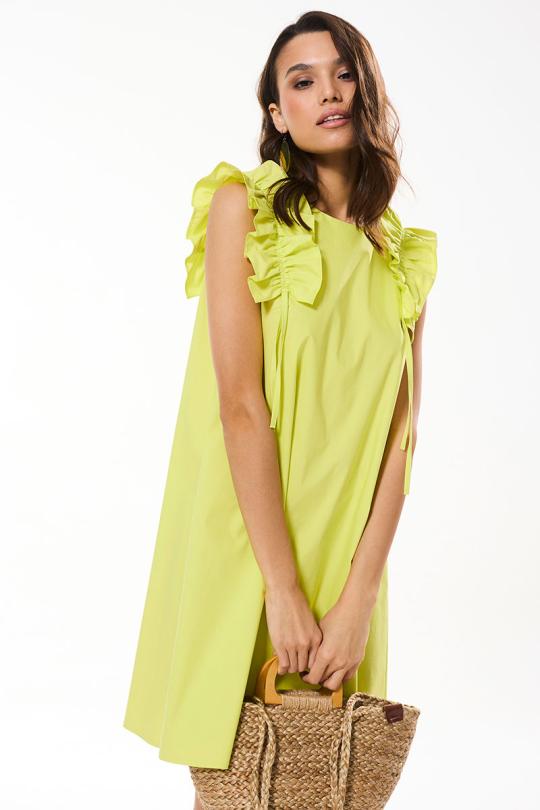 Платье расширенного к низу силуэта, без воротника, без рукавов, с застежкой на навесную петлю и пуговицу по горловине спинки. По переду с нагрудными вытачками. Спинка со средним швом. По верхней части переда и спинки- декоративные рюши с завязками.