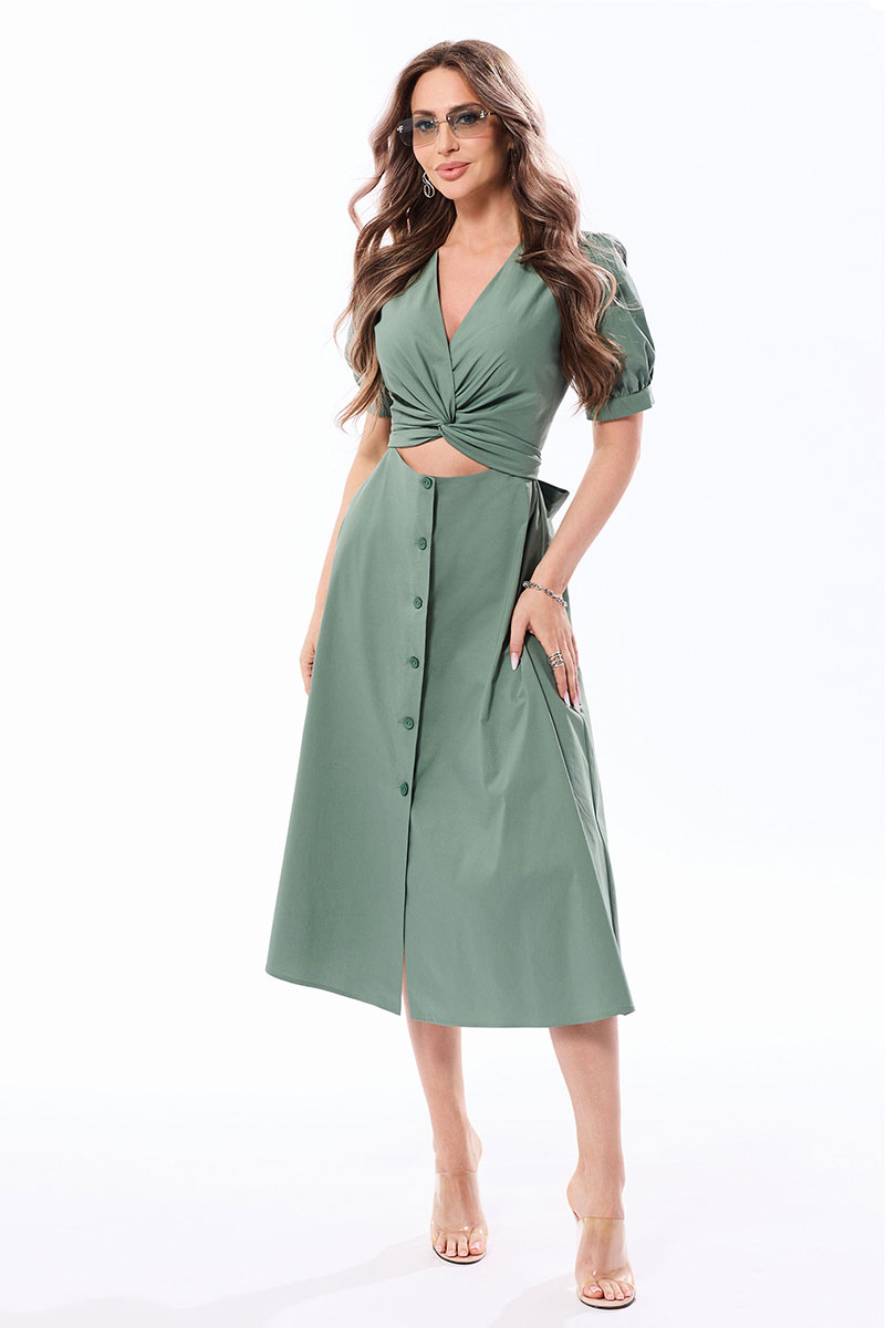 Платье без воротника, с V-образным вырезом горловины. Платье отрезное по линии талии. Полочки лифа переда располагаются на запах, с цельнокроенными завязками. Лиф спинки с талиевыми вытачками. Нижняя часть переда не закреплена к лифу, с центральной застежкой на петли и пуговицы. Шов по талии со стороны спинки присборен на резинку. Рукав втачной, короткий, с отрезной манжетой. Окат и шов притачивания манжеты присборен.