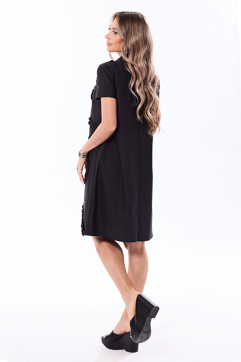 Платье расширенного к низу силуэта, с втачным воротником с отрезной стойкой, центральной застежкой на петли и пуговицы. По полочкам- нагрудные вытачки, настроченные декоративные рюши из основной ткани. Спинка со средним швом. Рукав втачной, короткий.