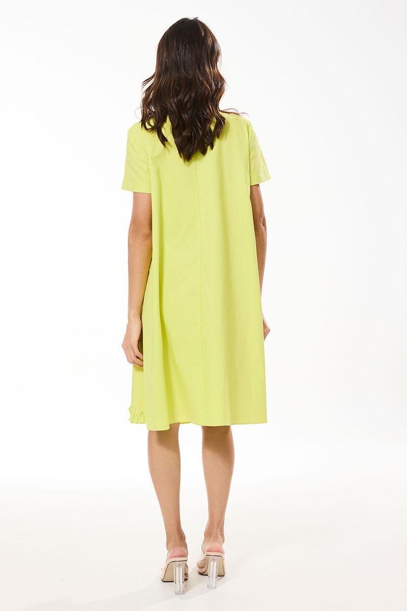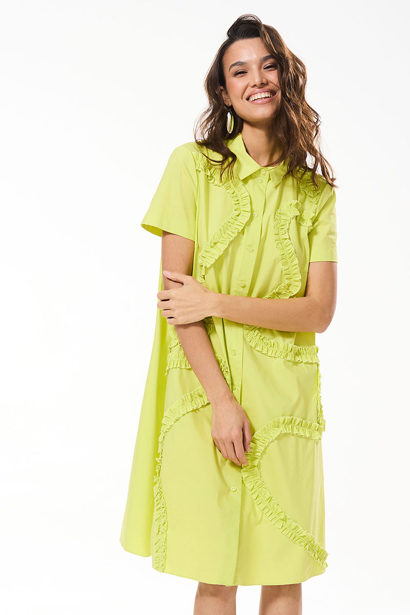 Платье расширенного к низу силуэта, с втачным воротником с отрезной стойкой, центральной застежкой на петли и пуговицы. По полочкам- нагрудные вытачки, настроченные декоративные рюши из основной ткани. Спинка со средним швом. Рукав втачной, короткий.