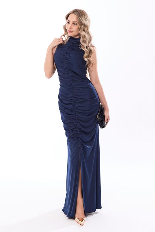 Платье с застежкой на потайную молнию в среднем шве спинки, с отрезной стойкой, без рукавов. По переду со средним швом, заканчивающимся разрезом. Средний шов переда присборен. Спинка со средним швом, талиевыми вытачками.