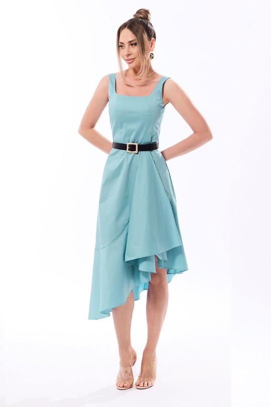 Платье без воротника, без рукавов, с фигурным вырезом горловины, с застежкой на потайную молнию в среднем шве спинки. Платье отрезное по линии талии. По лифу переда с рельефами, выходящими из горловины. Спинка со средним швом, по лифу спинки с рельефами, выходящими из горловины. Нижняя часть платья с отрезным фигурным воланом, закрепленным в виде складки по талиевому шву. Платье со съемным поясом.