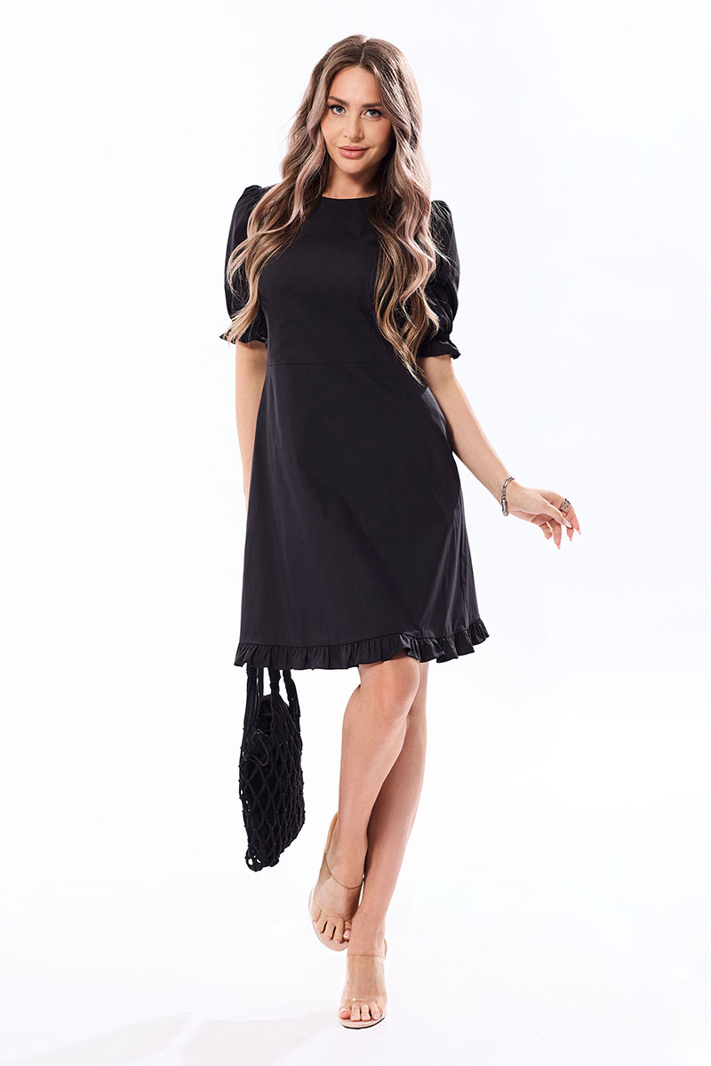Платье с застежкой на потайную молнию в среднем шве спинки, без воротника, с круглым вырезом горловины. По переду с рельефами, выходящими из проймы. Платье отрезное по линии талии. Нижняя часть переда и спинки расклешенная. Спинка со средним швом. Верхняя часть спинки с рельефами, выходящими из проймы. Нижняя часть платья с талиевыми вытачками. По низу платья- небольшой волан. Рукав втачной, короткий, со сборкой по окату. По нижней части рукава- сборка на резинку.