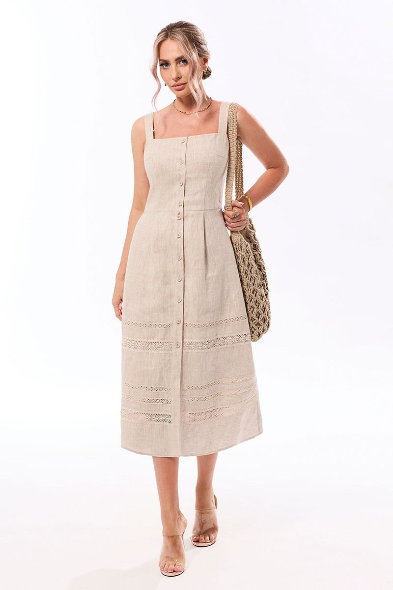 Платье с центральной застежкой на петли и пуговицы, без воротника, без рукавов, на бретелях. Платье отрезное по линии талии. Лиф переда с нагрудными и талиевыми вытачками. Лиф спинки со средним швом, талиевыми вытачками. Нижняя часть переда и спинки расширенная к низу, с двумя односторонними складками по переду и талиевыми вытачками по низу. По нижней части платья вставки из кружева разной ширины.