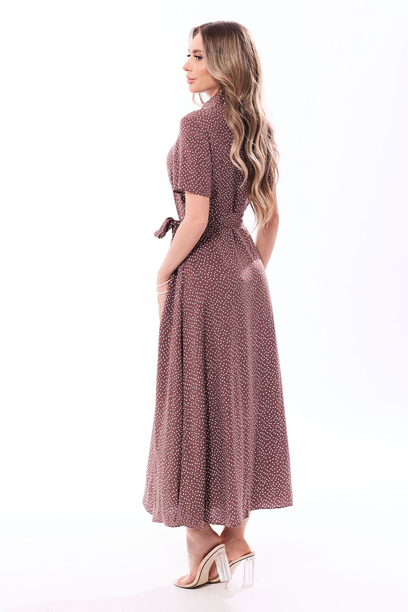 Платье с центральной застежкой на петли и пуговицы, с втачным воротником с отрезной стойкой. Платье отрезное по линии талии. По лифу переда, нагрудные и талиевые вытачки. Лиф спинки с талиевыми вытачками. Рукав втачной, короткий. В боковых швах расположены карманы. Платье со съемным поясом.